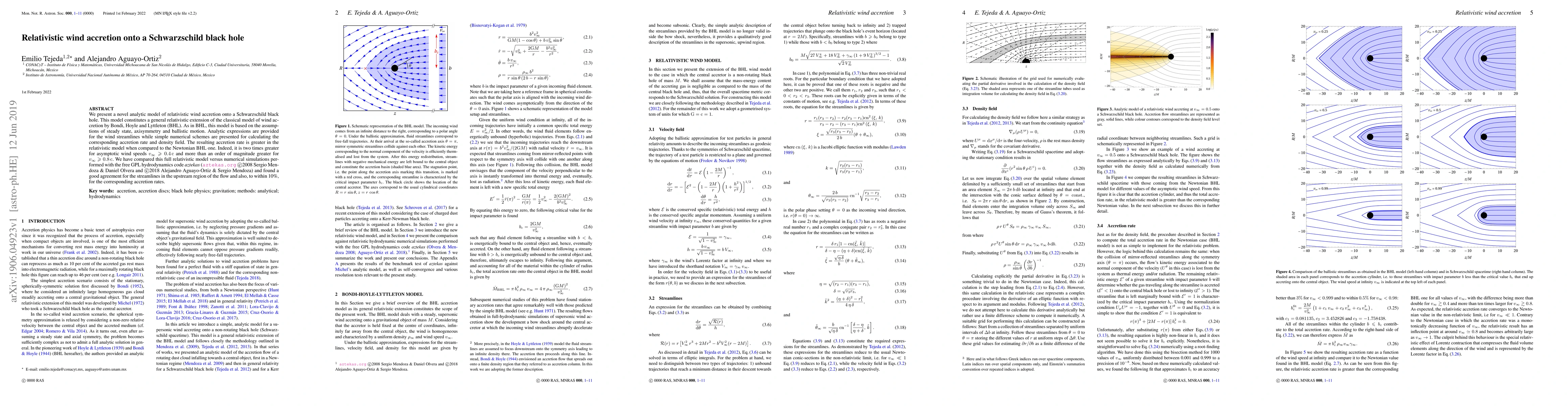 We present a novel analytic model of relativistic wind accretion on to a Schwarzschild black hole. This model constitutes a general relativistic extension of the classical model of wind accretion by Bondi, Hoyle, and Lyttleton (BHL). As in BHL, this model is based on the assumptions of steady state, axisymmetry, and ballistic motion. Analytic expressions are provided for the wind streamlines while simple numerical schemes are presented for calculating the corresponding accretion rate and density field. The resulting accretion rate is greater in the relativistic model when compared to the Newtonian BHL one. Indeed, it is two times greater for asymptotic wind speeds $v_\infty \ge 0.4\,\mathrm{c}$ and more than an order of magnitude greater for $v_\infty \ge 0.8\,\mathrm{c}$. We have compared this full relativistic model versus numerical simulations performed with the free GNU Public Licensed hydrodynamics code AZTEKAS and found a good agreement for the streamlines in the upstream region of the flow and also, to within 10 per cent, for the corresponding accretion rates.