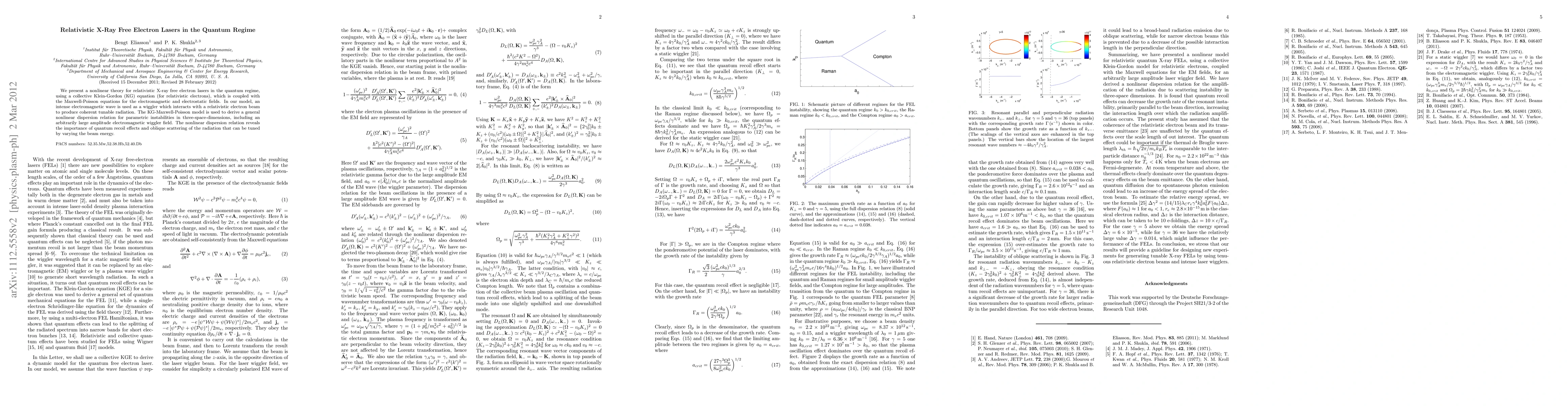 This paper develops a nonlinear theory for relativistic X-ray free electron lasers in the quantum regime, coupling the collective Klein-Gordon equation for electrons with Maxwell-Poisson equations for electromagnetic fields. The model highlights quantum recoil effects and oblique scattering, revealing how varying beam energy tunes coherent tunable radiation.