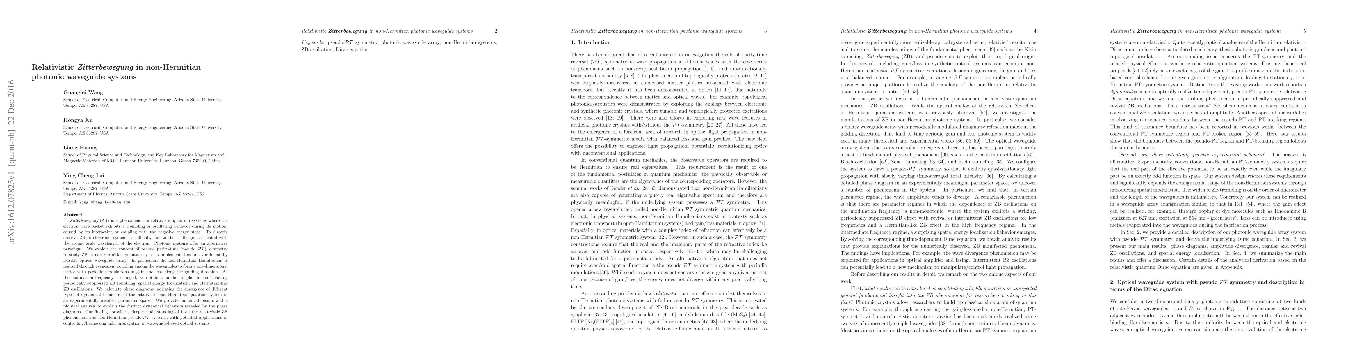 This paper investigates the relativistic Zitterbewegung phenomenon in non-Hermitian photonic waveguide systems using pseudo PT symmetry. It demonstrates experimentally feasible optical waveguide arrays that exhibit various dynamical behaviors, including suppressed ZB oscillations, energy localization, and Hermitian-like ZB oscillations, providing insights into both relativistic quantum mechanics and non-Hermitian systems.