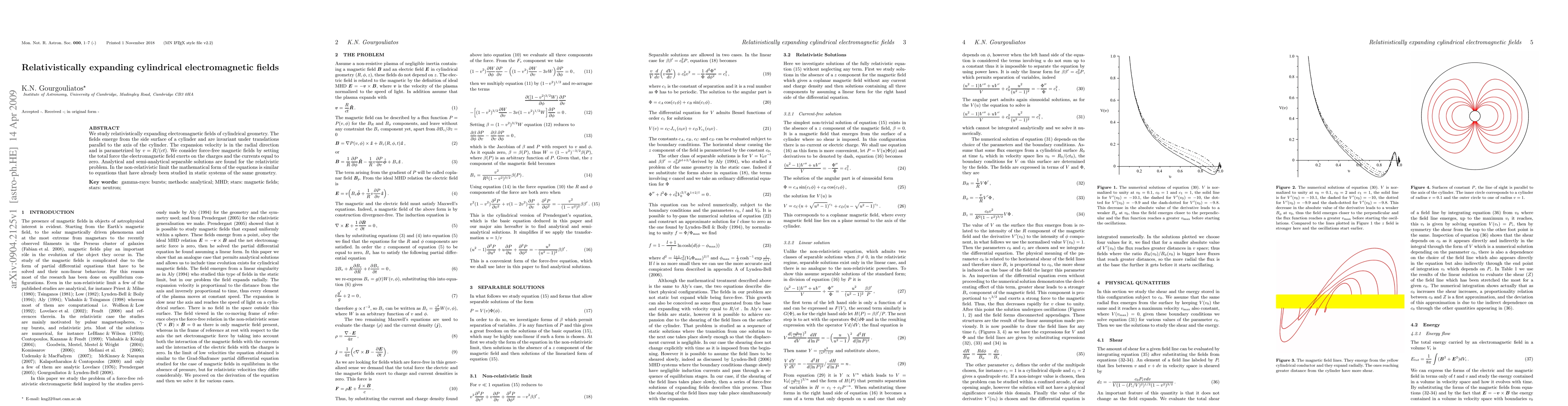 This paper investigates relativistically expanding cylindrical electromagnetic fields, focusing on force-free magnetic configurations. Analytical solutions are derived for these fields, which expand radially and maintain cylindrical symmetry.