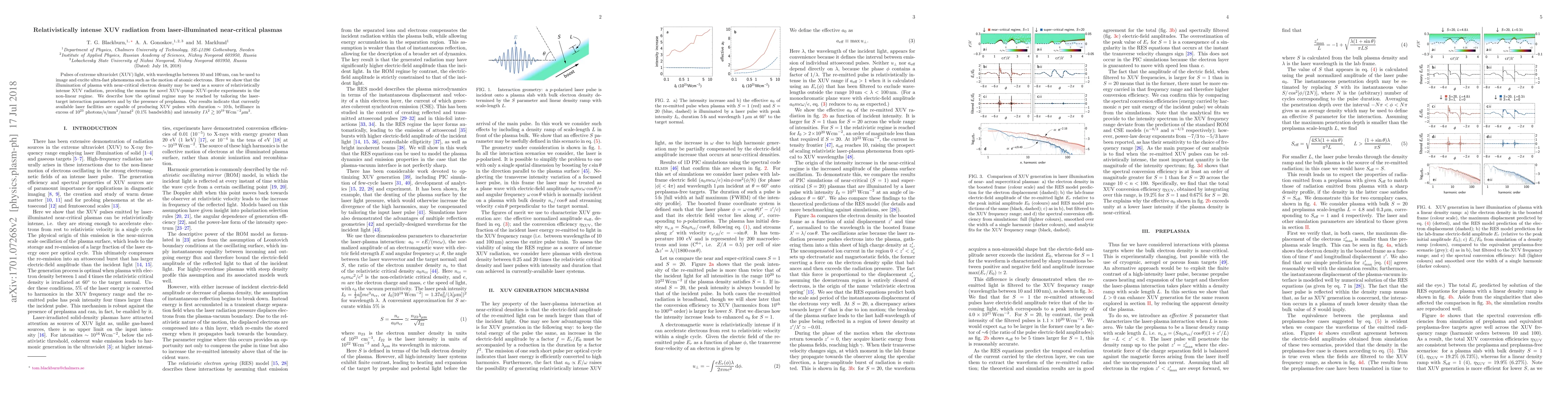 Pulses of extreme ultraviolet (XUV) light, with wavelengths between 10 and 100$\,$nm, can be used to image and excite ultra-fast phenomena such as the motion of atomic electrons. Here we show that the illumination of plasma with near-critical electron density may be used as a source of relativistically intense XUV radiation, providing the means for novel XUV-pump--XUV-probe experiments in the non-linear regime. We describe how the optimal regime may be reached by tailoring the laser-target interaction parameters and by the presence of preplasma. Our results indicate that currently available laser facilities are capable of producing XUV pulses with duration $\sim 10~\text{fs}$, brilliance in excess of $10^{23}$ photons/s/mm$^2$/mrad$^2$ (0.1% bandwidth) and intensity $I\lambda^2 \gtrsim 10^{19}~\text{W}\text{cm}^{-2}\mu\text{m}^2$.