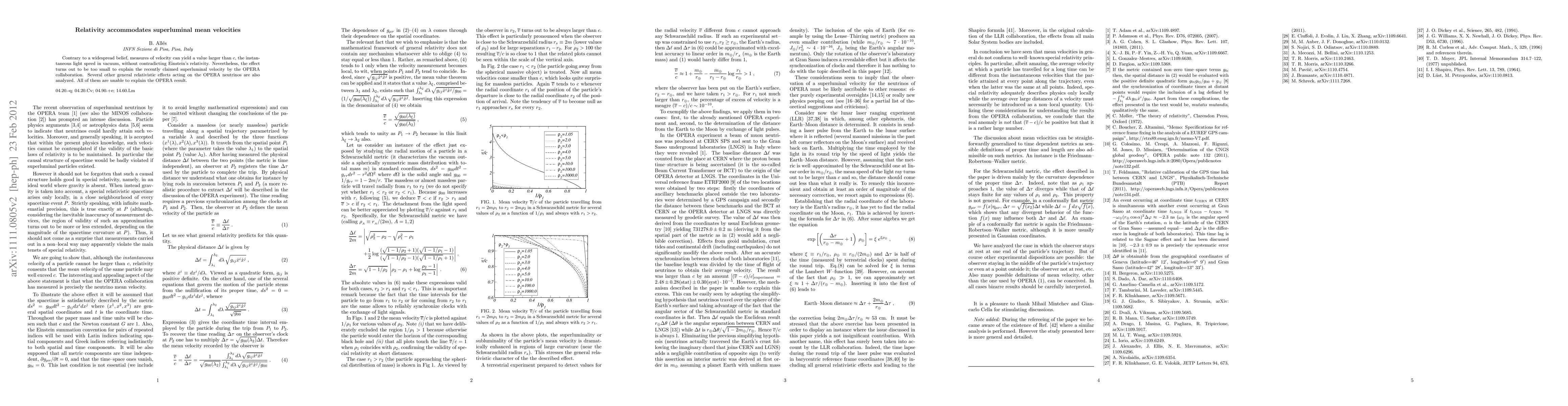 Contrary to a widespread belief, measures of velocity can yield a value larger than $c$, the instantaneous light speed in vacuum, without contradicting Einstein's relativity. Nevertheless, the effect turns out to be too small to explain the recently claimed superluminal velocity by the OPERA collaboration. Several other general relativistic effects acting on the OPERA neutrinos are also analyzed. All of them are unable to explain the OPERA result.