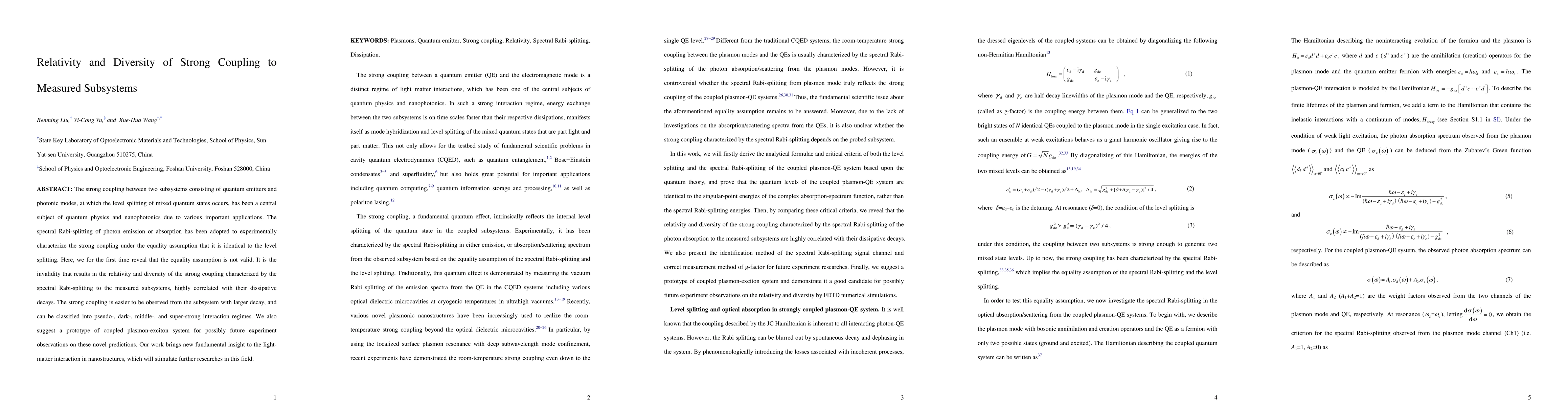 The strong coupling between two subsystems consisting of quantum emitters and photonic modes, at which the level splitting of mixed quantum states occurs, has been a central subject of quantum physics and nanophotonics due to various important applications. The spectral Rabi-splitting of photon emission or absorption has been adopted to experimentally characterize the strong coupling under the equality assumption that it is identical to the level splitting. Here, we for the first time reveal that the equality assumption is not valid. It is the invalidity that results in the relativity and diversity of the strong coupling characterized by the spectral Rabi-splitting to the measured subsystems, highly correlated with their dissipative decays. The strong coupling is easier to be observed from the subsystem with larger decay, and can be classified into pseudo-, dark-, middle-, and super-strong interaction regimes. We also suggest a prototype of coupled plasmon-exciton system for possibly future experiment observations on these novel predictions. Our work brings new fundamental insight to the light-matter interaction in nanostructures, which will stimulate further researches in this field.