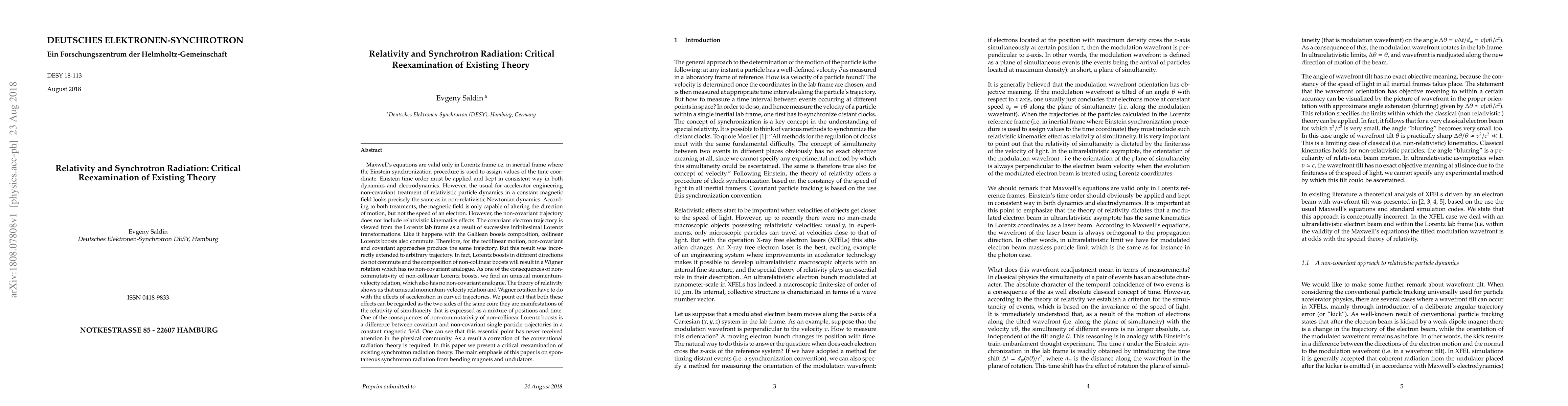 Maxwell's equations are valid only in Lorentz frame i.e. in inertial frame where the Einstein synchronization procedure is used to assign values of the time coordinate. Einstein time order must be applied and kept in consistent way in both dynamics and electrodynamics. However, the usual for accelerator engineering non-covariant treatment of relativistic particle dynamics in a constant magnetic field looks precisely the same as in non-relativistic Newtonian dynamics. According to both treatments, the magnetic field is only capable of altering the direction of motion, but not the speed of an electron. However, the non-covariant trajectory does not include relativistic kinematics effects. The covariant electron trajectory is viewed from the Lorentz lab frame as a result of successive infinitesimal Lorentz transformations. One of the consequences of non-commutativity of non-collinear Lorentz boosts is a difference between covariant and non-covariant single particle trajectories in a constant magnetic field. One can see that this essential point has never received attention in the physical community. As a result a correction of the conventional radiation theory is required. In this paper we present a critical reexamination of existing synchrotron radiation theory. The main emphasis of this paper is on spontaneous synchrotron radiation from bending magnets and undulators.