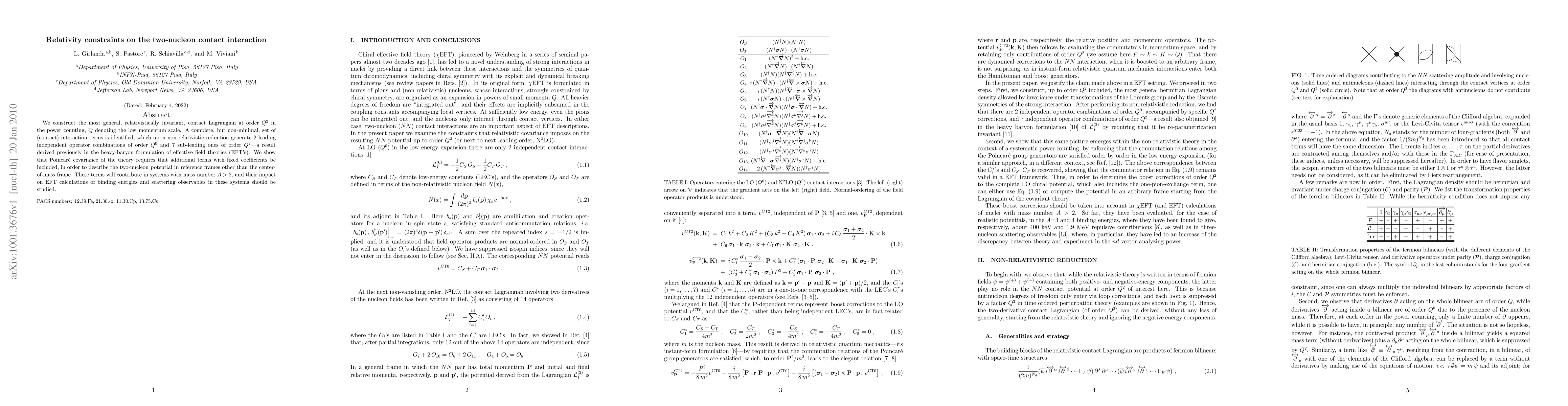 We construct the most general, relativistically invariant, contact Lagrangian at order Q^2 in the power counting, Q denoting the low momentum scale. A complete, but non-minimal, set of (contact) interaction terms is identified, which upon non-relativistic reduction generate 2 leading independent operator combinations of order Q^0 and 7 sub-leading ones of order Q^2 - a result derived previously in the heavy-baryon formulation of effective field theories (EFT's). We show that Poincare covariance of the theory requires that additional terms with fixed coefficients be included, in order to describe the two-nucleon potential in reference frames other than the center-of-mass frame. These terms will contribute in systems with mass number A>2, and their impact on EFT calculations of binding energies and scattering observables in these systems should be studied.