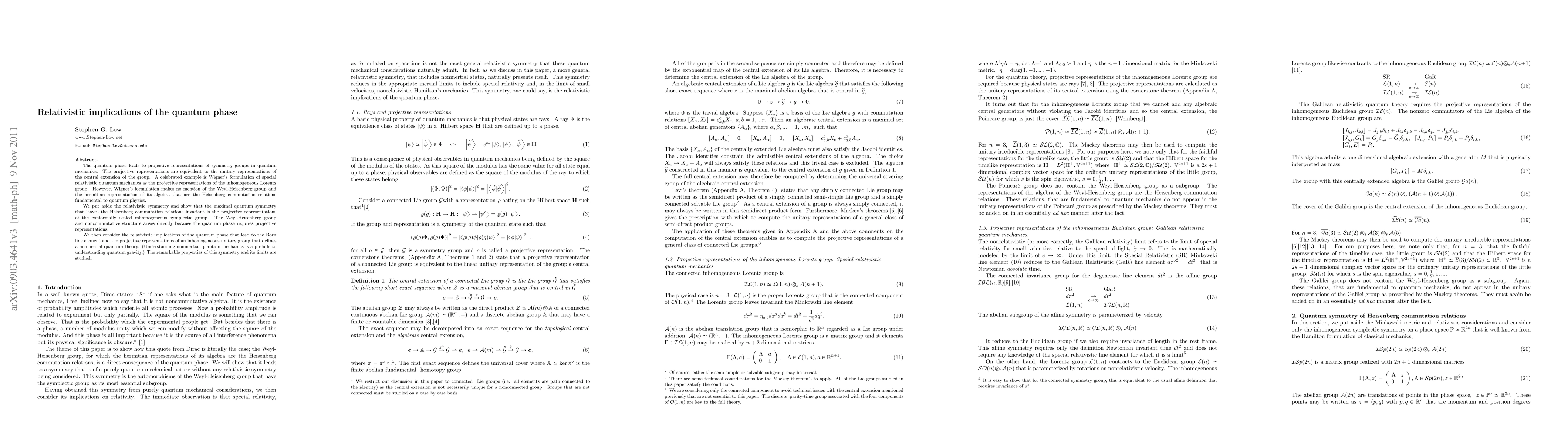 The quantum phase leads to projective representations of symmetry groups in quantum mechanics. The projective representations are equivalent to the unitary representations of the central extension of the group. A celebrated example is Wigner's formulation of special relativistic quantum mechanics as the projective representations of the inhomogeneous Lorentz group. However, Wigner's formulation makes no mention of the Weyl-Heisenberg group and the hermitian representation of its algebra that are the Heisenberg commutation relations fundamental to quantum physics. We put aside the relativistic symmetry and show that the maximal quantum symmetry that leaves the Heisenberg commutation relations invariant is the projective representations of the conformally scaled inhomogeneous symplectic group. The Weyl-Heisenberg group and noncommutative structure arises directly because the quantum phase requires projective representations. We then consider the relativistic implications of the quantum phase that lead to the Born line element and the projective representations of an inhomogeneous unitary group that defines a noninertial quantum theory. (Understanding noninertial quantum mechanics is a prelude to understanding quantum gravity.) The remarkable properties of this symmetry and its limits are studied.