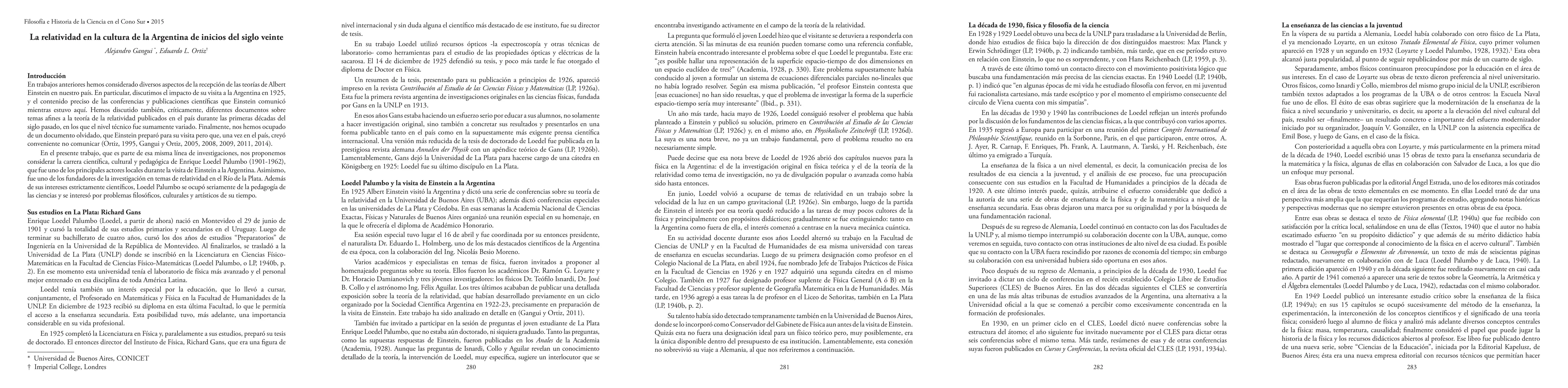 In previous works we have considered various aspects of the reception of the theories of Albert Einstein in our country. In particular, we discussed the impact of his visit to Argentina in 1925, and the precise content of the conferences and scientific publications that Einstein communicated while he was here. We have also discussed, critically, different documents on topics related to the theory of relativity published in the country during the first decades of the last century, in which the technical level was extremely varied. Finally, we have dealt with a forgotten document, which Einstein prepared for his visit but, once in the country, thought it convenient not to communicate. In the present work, which is part of that same line of research, we propose to consider the scientific, cultural and pedagogical career of Enrique Loedel Palumbo (1901-1962), who was one of the main local actors during Einstein's visit to Argentina. He was also one of the founders of the research on relativity issues in the Rio de la Plata. In addition to his strictly scientific interests, Loedel Palumbo took seriously the pedagogy of science and became interested in philosophical, cultural and artistic problems of his time.