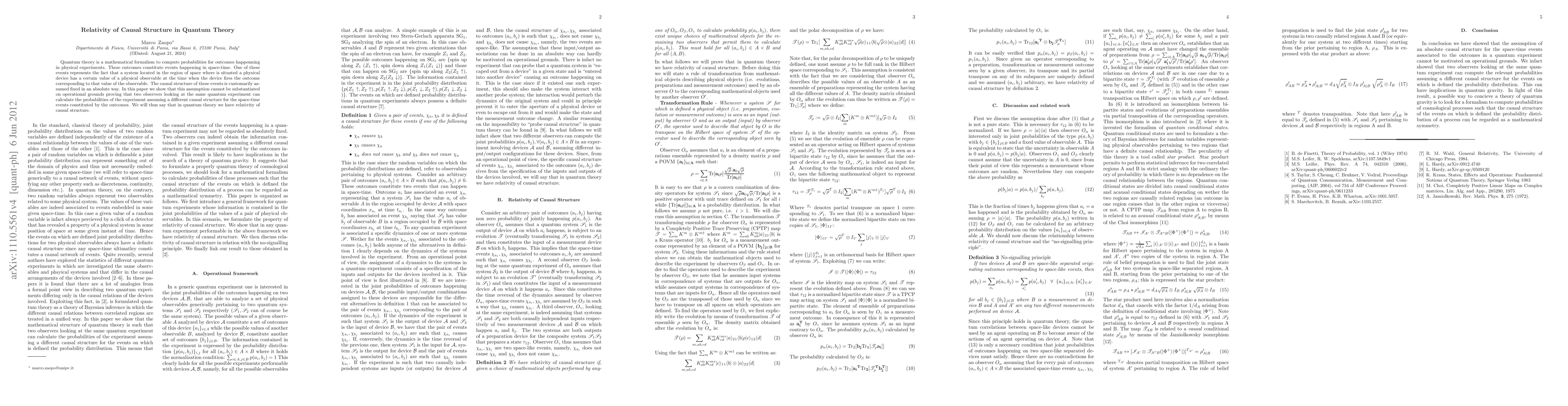 Quantum theory is a mathematical formalism to compute probabilities for outcomes happenning in physical experiments. These outcomes constitute events happening in space-time. One of these events represents the fact that a system located in the region of space where is situated a physical device has a certain value of a physical observable at the time when the device fires the outcome corresponding to that value of the observable. The causal structure of these events is customarily assumed fixed in an absolute way. In this paper we show that this assumption cannot be substantiated on operational grounds proving that two observers looking at the same quantum experiment can calculate the probabilities of the experiment assuming a different causal structure for the space-time events constituted by the outcomes. We will thus say that in quantum theory we have relativity of causal structure.