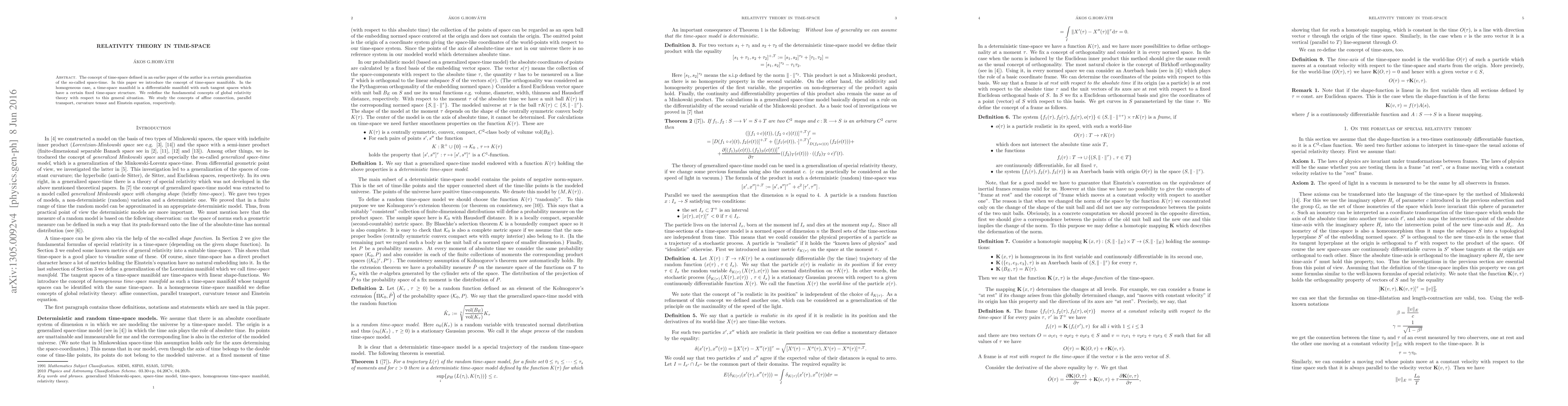 The concept of time-space defined in an earlier paper of the author is a certain generalization of the so-called space-time. In this paper we introduce the concept of time-space manifolds. In the homogeneous case, a time-space manifold is a differentiable manifold with such tangent spaces which have a certain fixed time-space structure. We redefine the fundamental concepts of global relativity theory with respect to this general situation. We study the concepts of affine connection, parallel transport, curvature tensor and Einstein equation, respectively.
