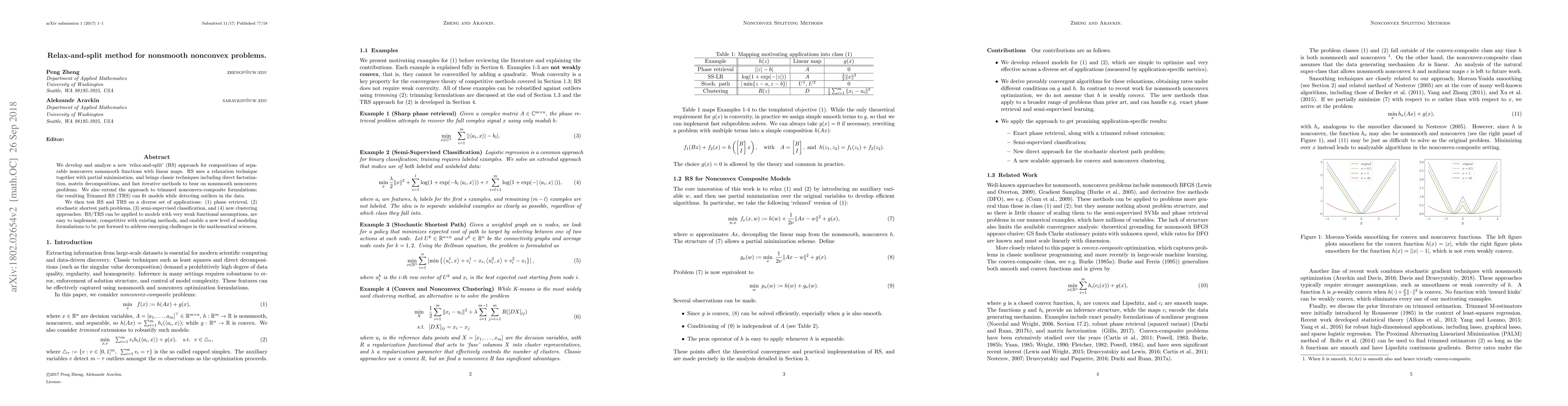We develop and analyze a new `relax-and-split' (RS) approach for compositions of separable nonconvex nonsmooth functions with linear maps. RS uses a relaxation technique together with partial minimization, and brings classic techniques including direct factorization, matrix decompositions, and fast iterative methods to bear on nonsmooth nonconvex problems. We also extend the approach to trimmed nonconvex-composite formulations; the resulting Trimmed RS (TRS) can fit models while detecting outliers in the data. We then test RS and TRS on a diverse set of applications: (1) phase retrieval, (2) stochastic shortest path problems, (3) semi-supervised classification, and (4) new clustering approaches. RS/TRS can be applied to models with very weak functional assumptions, are easy to implement, competitive with existing methods, and enable a new level of modeling formulations to be put forward to address emerging challenges in the mathematical sciences.