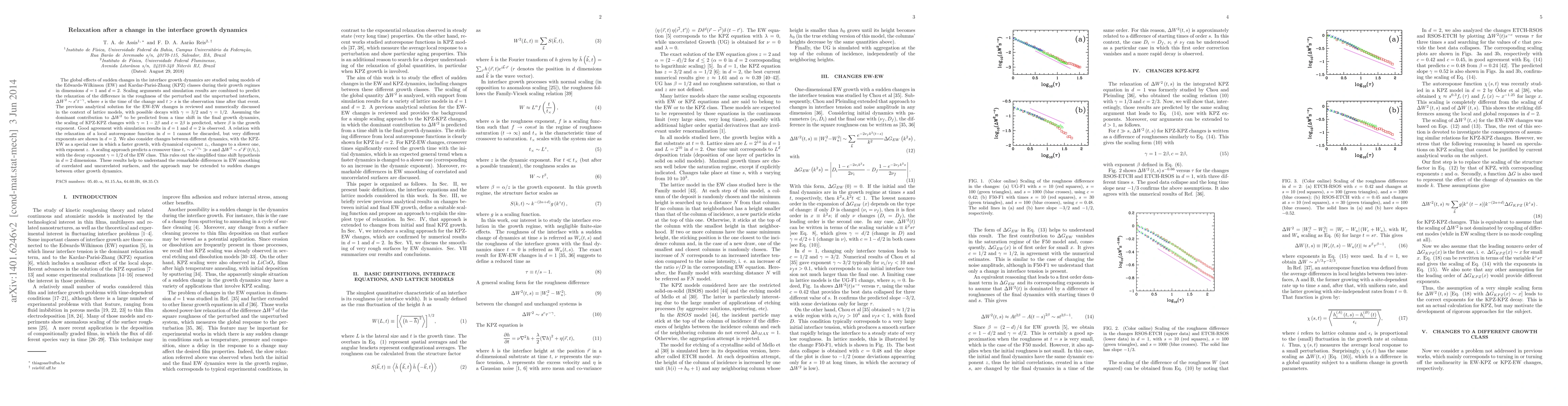 The global effects of sudden changes in the interface growth dynamics are studied using models of the Edwards-Wilkinson (EW) and Kardar-Parisi-Zhang (KPZ) classes during their growth regimes in dimensions $d=1$ and $d=2$. Scaling arguments and simulation results are combined to predict the relaxation of the difference in the roughness of the perturbed and the unperturbed interfaces, $\Delta W^2 \sim s^c t^{-\gamma}$, where $s$ is the time of the change and $t>s$ is the observation time after that event. The previous analytical solution for the EW-EW changes is reviewed and numerically discussed in the context of lattice models, with possible decays with $\gamma=3/2$ and $\gamma=1/2$. Assuming the dominant contribution to $\Delta W^2$ to be predicted from a time shift in the final growth dynamics, the scaling of KPZ-KPZ changes with $\gamma = 1-2\beta$ and $c=2\beta$ is predicted, where $\beta$ is the growth exponent. Good agreement with simulation results in $d=1$ and $d=2$ is observed. A relation with the relaxation of a local autoresponse function in $d=1$ cannot be discarded, but very different exponents are shown in $d=2$. We also consider changes between different dynamics, with the KPZ-EW as a special case in which a faster growth, with dynamical exponent $z_i$, changes to a slower one, with exponent $z$. A scaling approach predicts a crossover time $t_c\sim s^{z/z_i}\gg s$ and $\Delta W^2 \sim s^c F\left( t/t_c\right)$, with the decay exponent $\gamma=1/2$ of the EW class. This rules out the simplified time shift hypothesis in $d=2$ dimensions. These results help to understand the remarkable differences in EW smoothing of correlated and uncorrelated surfaces, and the approach may be extended to sudden changes between other growth dynamics.