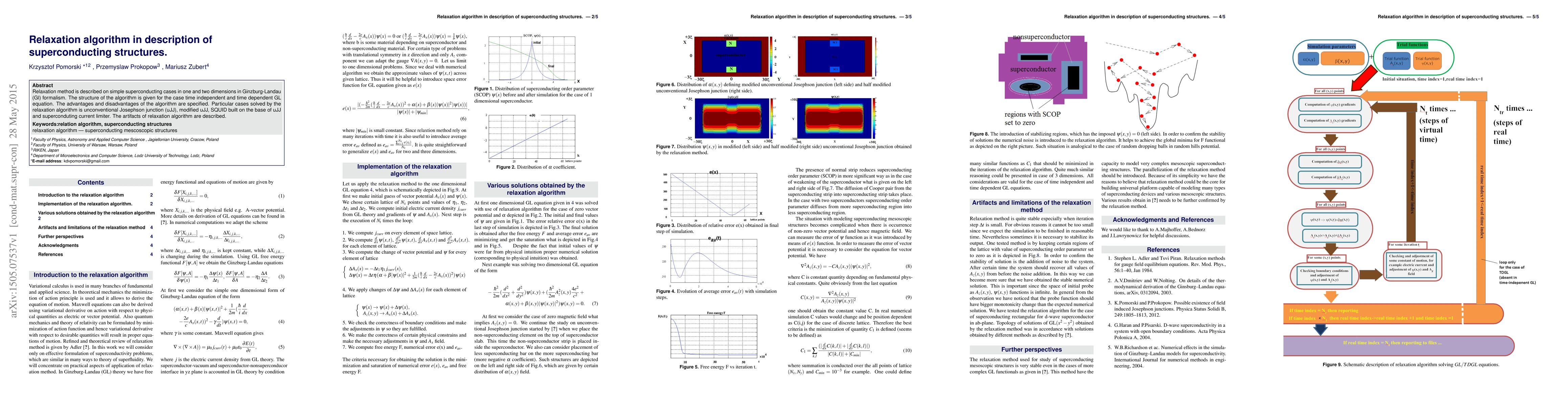 Relaxation method is described on simple superconducting cases in one and two dimensions in Ginzburg-Landau (GL) formalism. The structure of the algorithm is given for the case time independent and time dependent GL equation. The advantages and disadvantages of the algorithm are specified. Particular cases solved by the relaxation algorithm is unconventional Josephson junction (uJJ), modified uJJ, SQUID built on the base of uJJ and superconduting current limiter. The artifacts of relaxation algorithm are described.