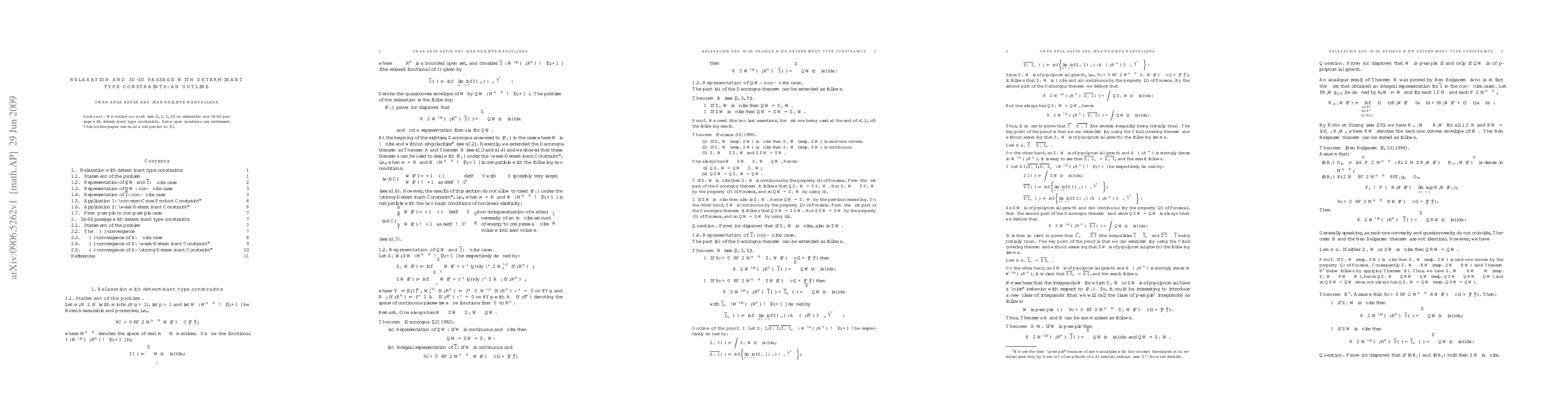 We outline our work (see [1,2,3,4]) on relaxation and 3d-2d passage with determinant type constraints. Some open questions are addressed. This outline-paper comes as a companion to [5].