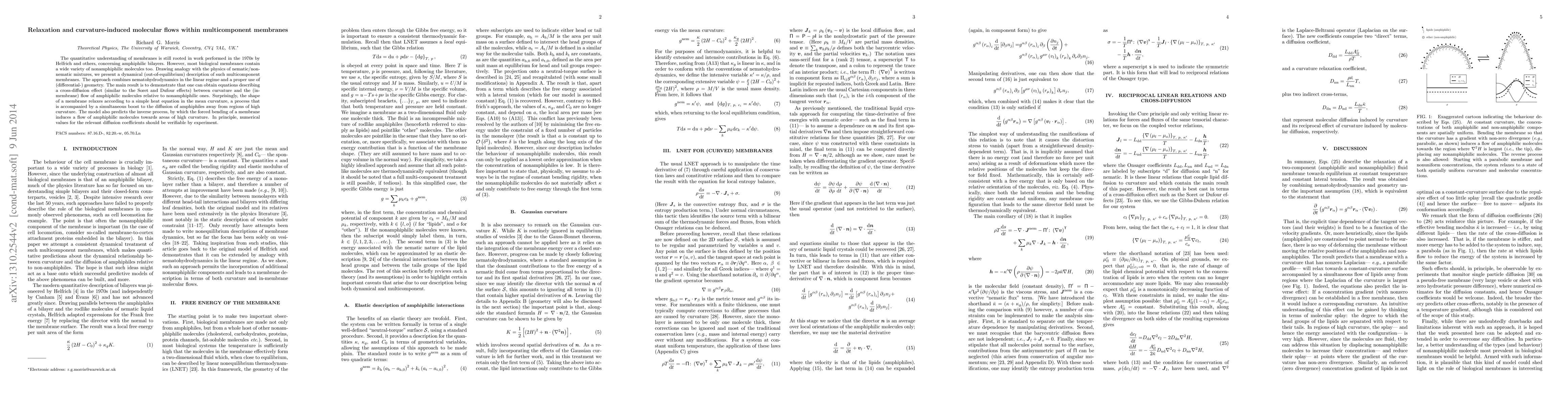 The quantitative understanding of membranes is still rooted in work performed in the 1970s by Helfrich and others, concerning amphiphilic bilayers. However, most biological membranes contain a wide variety of nonamphiphilic molecules too. Drawing analogy with the physics of nematic/non-nematic mixtures, we present a dynamical (out of equilibrium) description of such multicomponent membranes. The approach combines nematohydrodynamics in the linear regime and a proper use of (differential) geometry. The main result is to demonstrate that one can obtain equations describing a cross-diffusion effect (similar to the Soret and Dufour effects) between curvature and the (in-membrane) flow of amphiphilic molecules relative to nonamphiphilic ones. Surprisingly, the shape of a membrane relaxes according to a simple heat equation in the mean curvature, a process that is accompanied by a simultaneous boost to the diffusion of amphiphiles away from regions of high curvature. The model also predicts the inverse process, by which the forced bending of a membrane induces a flow of amphiphilic molecules towards areas of high curvature. In principle, numerical values for the relevant diffusion coefficients should be verifiable by experiment.