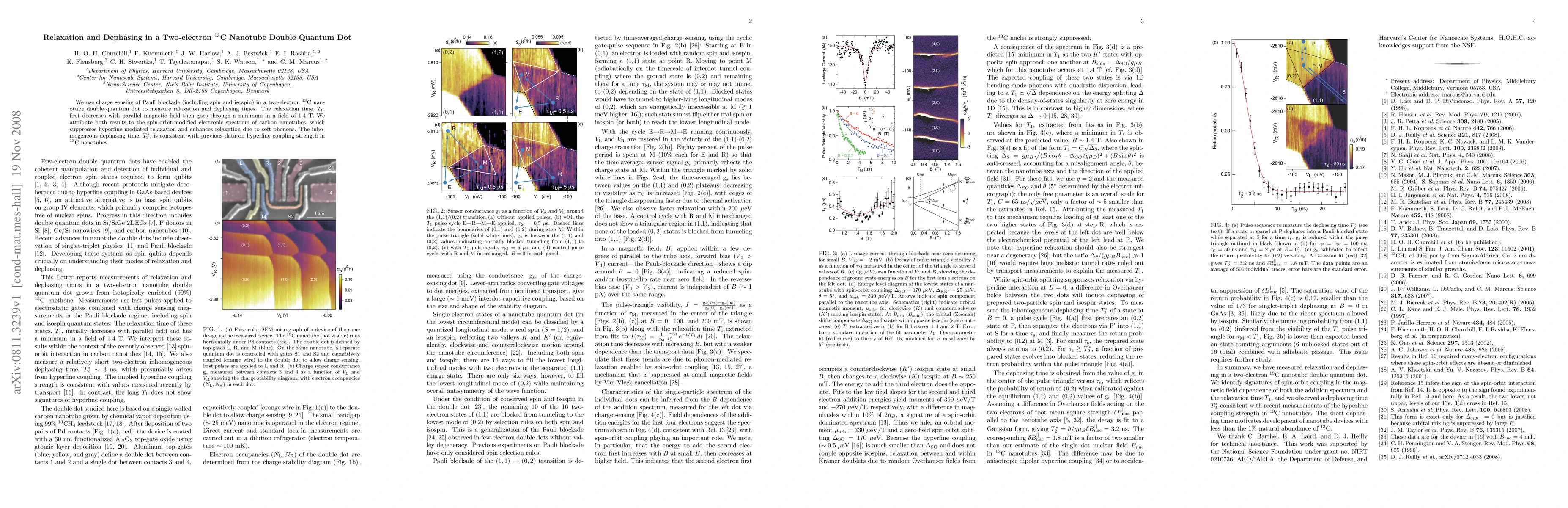 This study investigates relaxation and dephasing in a two-electron 13C nanotube double quantum dot using charge sensing of Pauli blockade. The relaxation time, T1, decreases with parallel magnetic field and reaches a minimum at 1.4 T, attributed to the spin-orbit-modified electronic spectrum of carbon nanotubes, while the inhomogeneous dephasing time, T2*, aligns with prior data on hyperfine coupling strength.