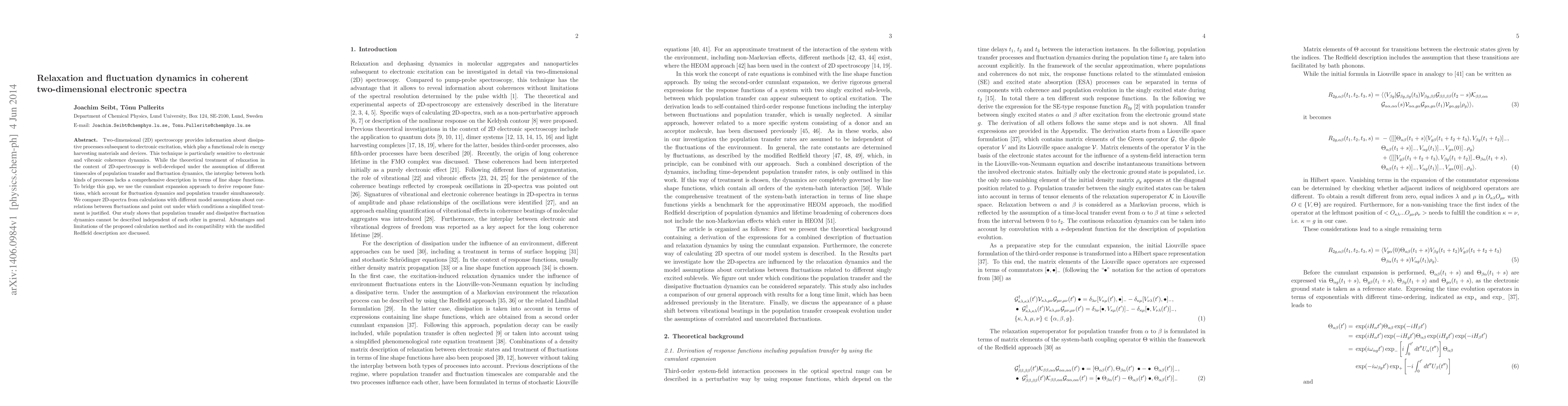 Two-dimensional (2D) spectroscopy provides information about dissipative processes subsequent to electronic excitation, which play a functional role in energy harvesting materials and devices. This technique is particularly sensitive to electronic and vibronic coherence dynamics. While the theoretical treatment of relaxation in the context of 2D-spectroscopy is well-developed under the assumption of different timescales of population transfer and fluctuation dynamics, the interplay between both kinds of processes lacks a comprehensive description in terms of line shape functions. To bridge this gap, we use the cumulant expansion approach to derive response functions, which account for fluctuation dynamics and population transfer simultaneously. We compare 2D-spectra from calculations with different model assumptions about correlations between fluctuations and point out under which conditions a simplified treatment is justified. Our study shows that population transfer and dissipative fluctuation dynamics cannot be described independent of each other in general. Advantages and limitations of the proposed calculation method and its compatibility with the modified Redfield description are discussed.