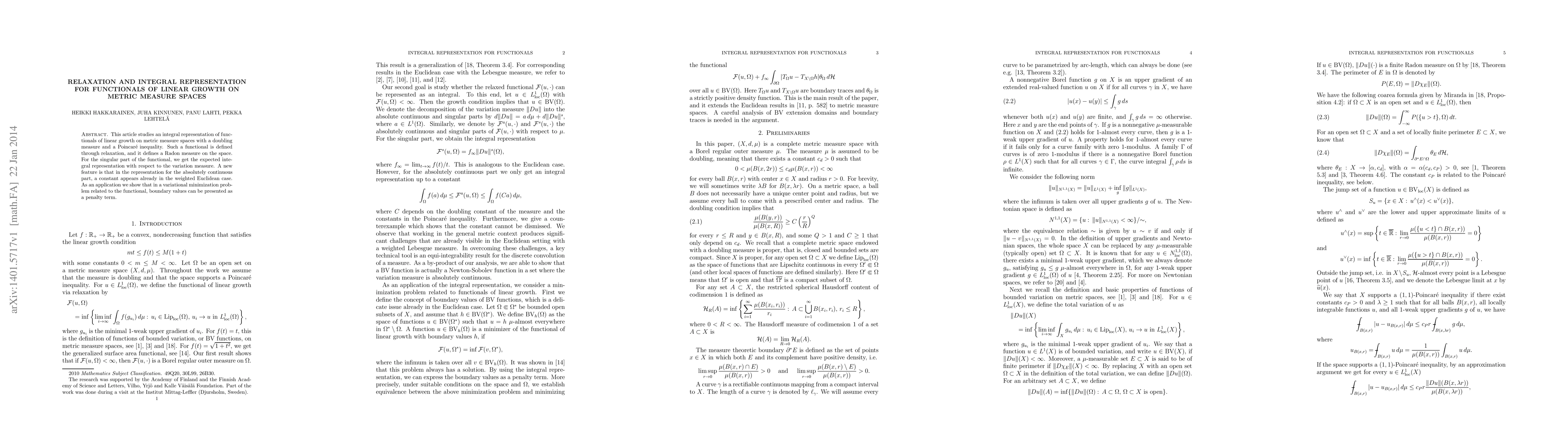 This article studies an integral representation of functionals of linear growth on metric measure spaces with a doubling measure and a Poincar\'e inequality. Such a functional is defined through relaxation, and it defines a Radon measure on the space. For the singular part of the functional, we get the expected integral representation with respect to the variation measure. A new feature is that in the representation for the absolutely continuous part, a constant appears already in the weighted Euclidean case. As an application we show that in a variational minimization problem related to the functional, boundary values can be presented as a penalty term.