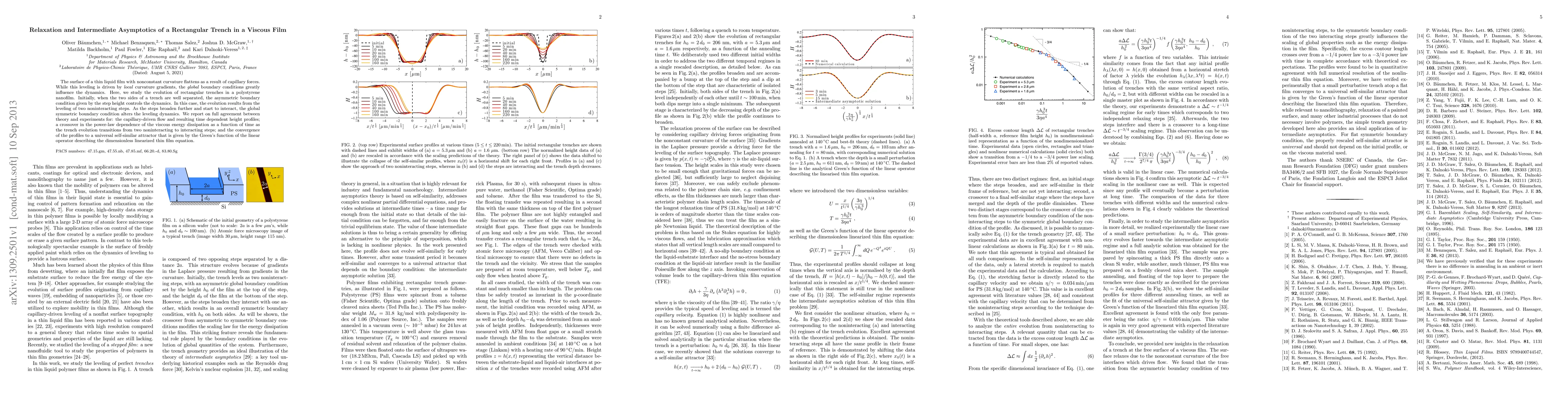 This paper investigates the relaxation and intermediate asymptotic behavior of rectangular trenches in a viscous polystyrene nanofilm, demonstrating theoretical and experimental agreement on the capillary-driven flow, energy dissipation crossover, and the emergence of a universal self-similar attractor profile.