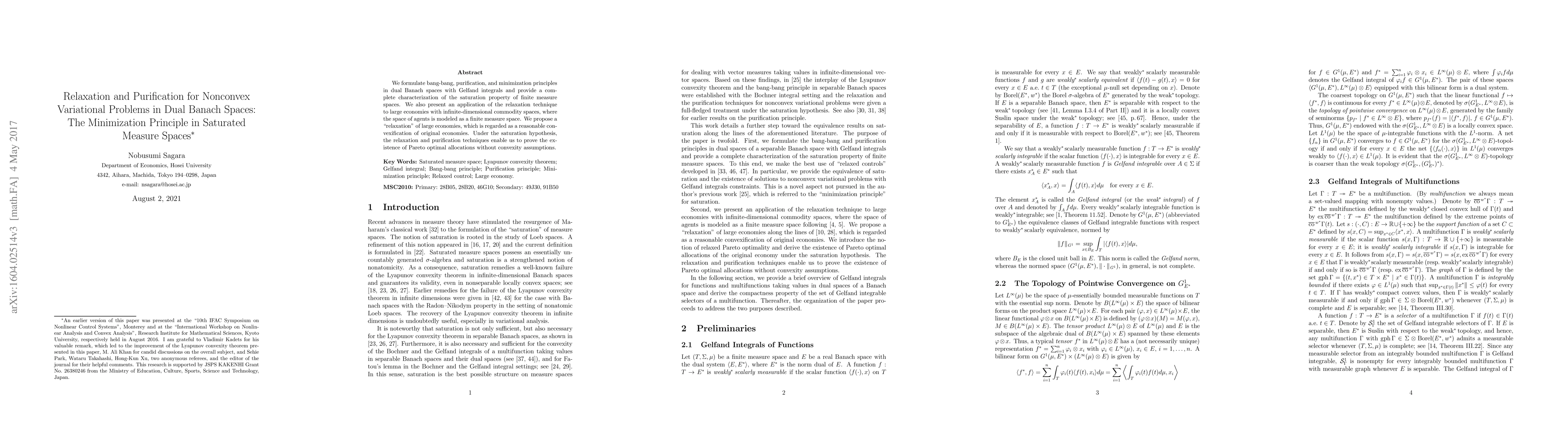 We formulate bang-bang, purification, and minimization principles in dual Banach spaces with Gelfand integrals and provide a complete characterization of the saturation property of finite measure spaces. We also present a new application of the relaxation technique to large economies with infinite-dimensional commodity spaces, where the space of agents is modeled as a finite measure space. We propose a "relaxation" of large economies, which is regarded as a reasonable convexification of original economies. Under the saturation hypothesis, the relaxation and purification techniques enable us to prove the existence of Pareto optimal allocations without convexity assumptions.