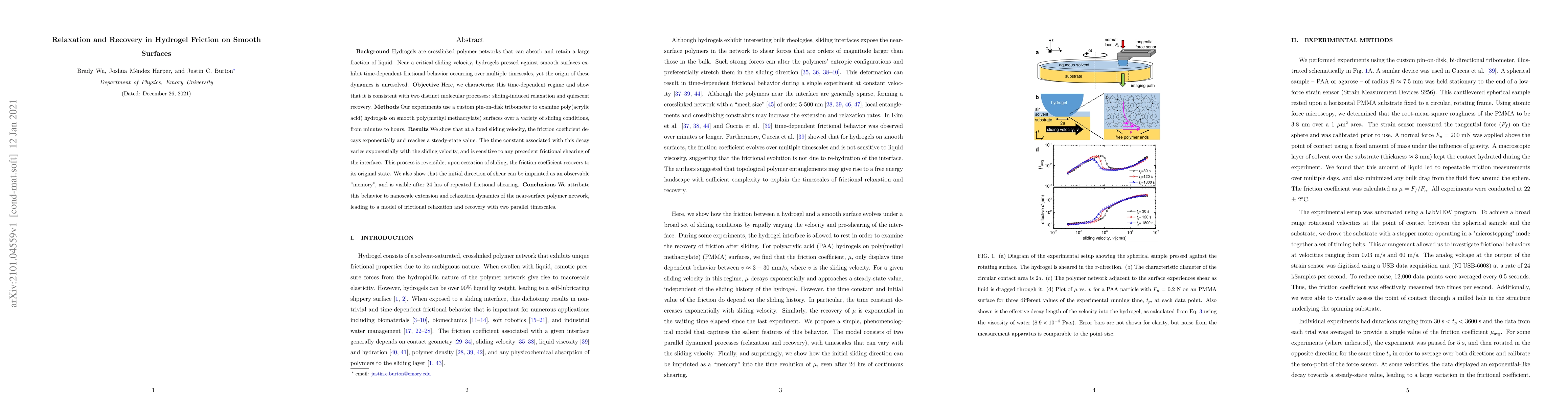 Researchers studied how hydrogels behave when rubbed against smooth surfaces, finding that they exhibit time-dependent frictional behavior due to molecular relaxation and recovery processes.