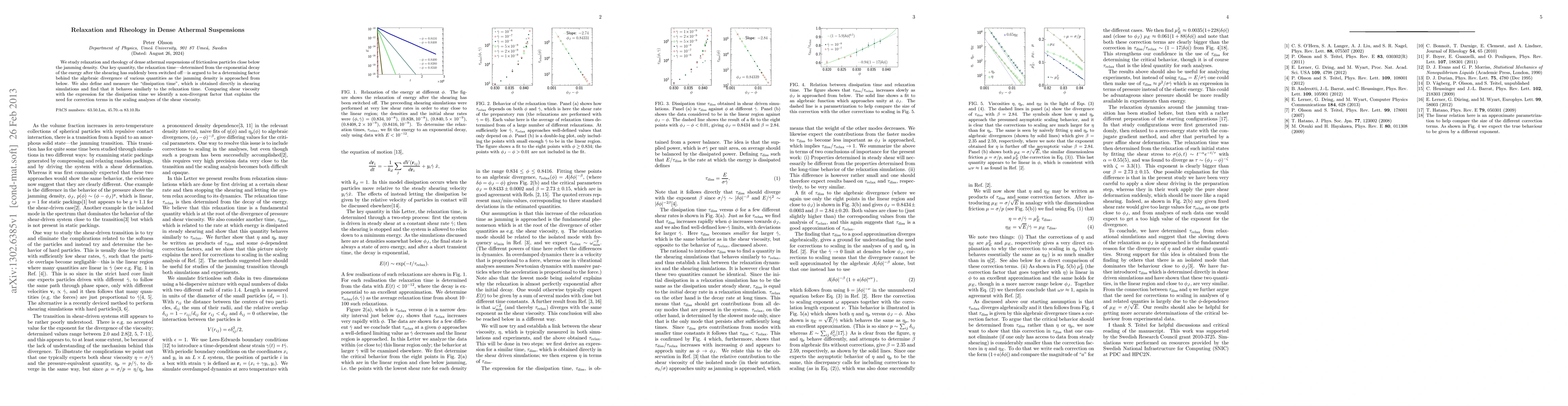 This paper investigates the relaxation and rheological properties of dense athermal suspensions of frictionless particles near the jamming density, focusing on the relaxation time and its role in the divergence of various quantities. It also defines and measures the "dissipation time," finding it behaves similarly to the relaxation time, and identifies a non-divergent factor that corrects scaling analyses of shear viscosity.