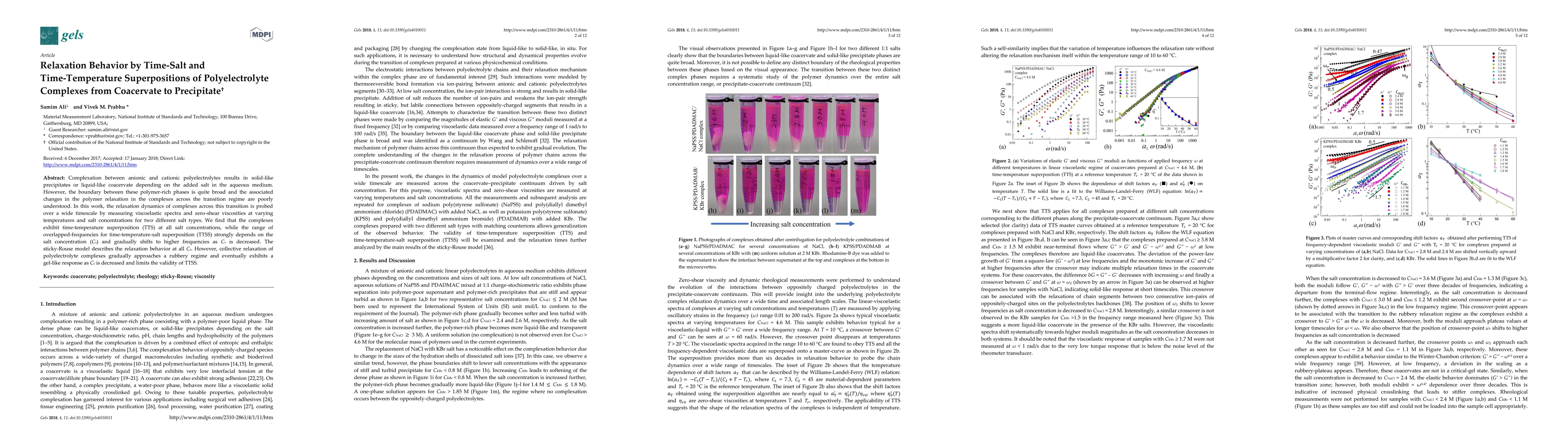 Polyelectrolyte complexes exhibit time-temperature superposition across a transition regime, with relaxation behavior shifting to higher frequencies as salt concentration decreases.