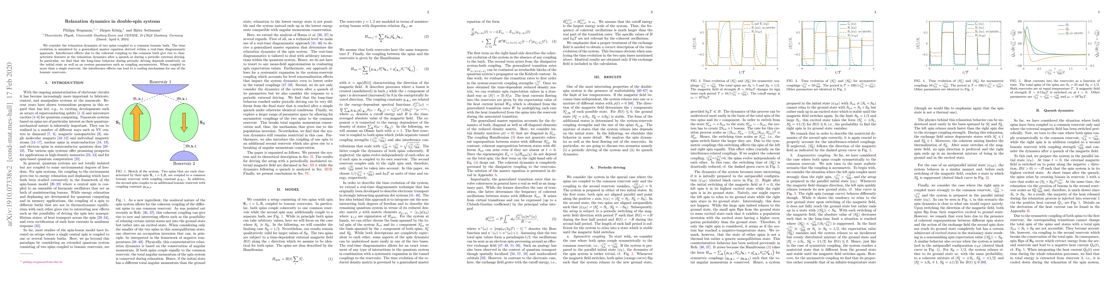 We consider the relaxation dynamics of two spins coupled to a common bosonic bath. The time evolution is simulated by a generalized master equation derived within a real-time diagrammatic approach. Interference effects due to the coherent coupling to the common bath give rise to characteristic features in the relaxation dynamics after a quench or during a periodic external driving. In particular, we find that the long-time behavior during periodic driving depends sensitively on the initial state as well as on system parameters such as coupling asymmetries. When coupled to more than a single reservoir, the interference effects can lead to a cooling mechanism for one of the bosonic reservoirs.