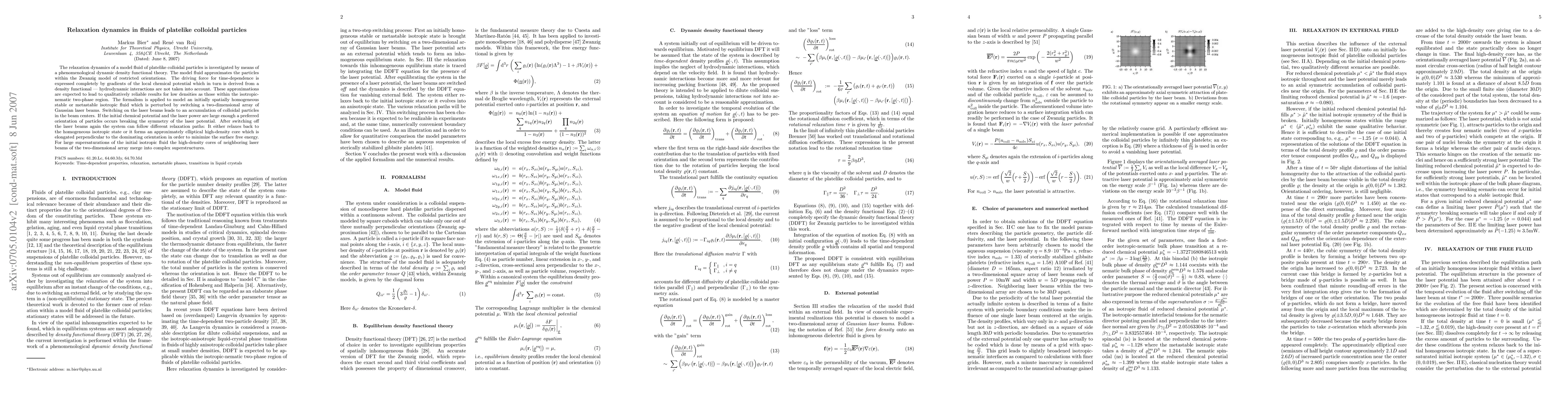 This paper explores the relaxation dynamics of platelike colloidal particles using a dynamic density functional theory, focusing on low-density fluids. The study reveals that after laser perturbation, the system can either return to an isotropic state or form high-density elliptical cores, which may merge into complex superstructures under high supersaturation.