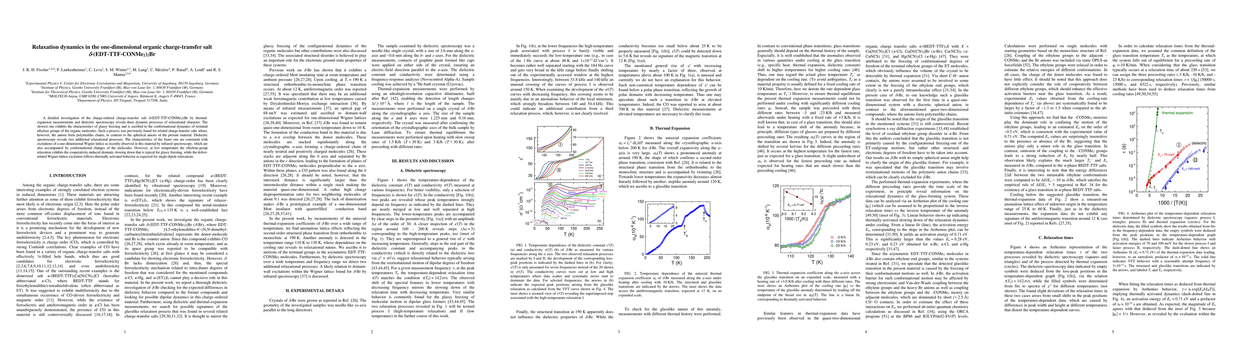 This study investigates the relaxation dynamics in the charge-transfer salt δ-(EDT-TTF-CONMe$_2$)$_2$Br using thermal-expansion and dielectric spectroscopy, revealing three relaxation processes. The slowest process shows glassy freezing behavior linked to conformational dynamics of terminal ethylene groups, while the faster processes relate to a one-dimensional Wigner lattice and its associated molecular conformational changes.