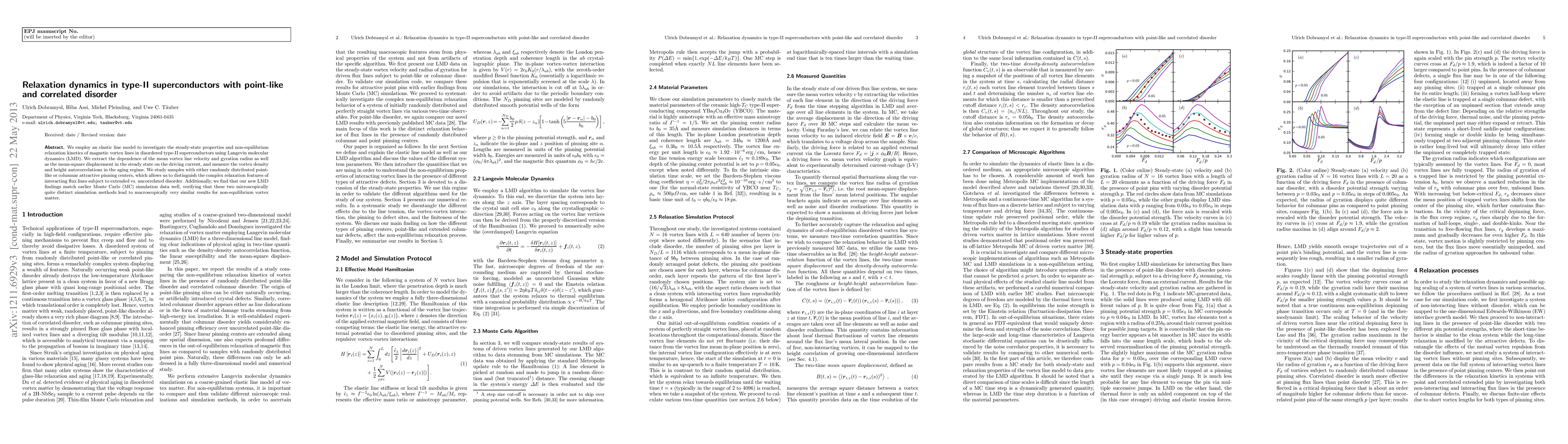 This research utilizes an elastic line model and Langevin molecular dynamics to examine magnetic vortex dynamics in type-II superconductors with varying types of disorder. It compares the relaxation kinetics and steady-state properties under different pinning center distributions, finding that the vortex behavior aligns with prior Monte Carlo simulation results.