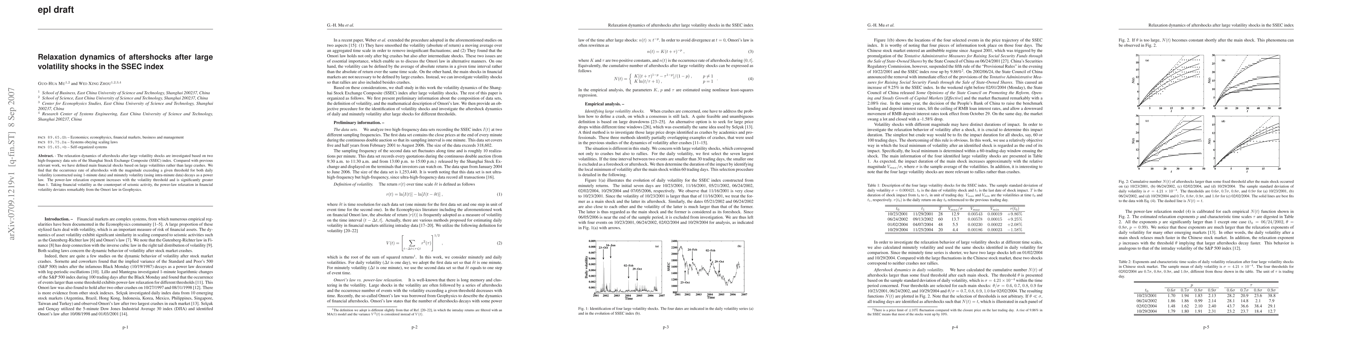 The relaxation dynamics of aftershocks after large volatility shocks are investigated based on two high-frequency data sets of the Shanghai Stock Exchange Composite (SSEC) index. Compared with previous relevant work, we have defined main financial shocks based on large volatilities rather than large crashes. We find that the occurrence rate of aftershocks with the magnitude exceeding a given threshold for both daily volatility (constructed using 1-minute data) and minutely volatility (using intra-minute data) decays as a power law. The power-law relaxation exponent increases with the volatility threshold and is significantly greater than 1. Taking financial volatility as the counterpart of seismic activity, the power-law relaxation in financial volatility deviates remarkably from the Omori law in Geophysics.
