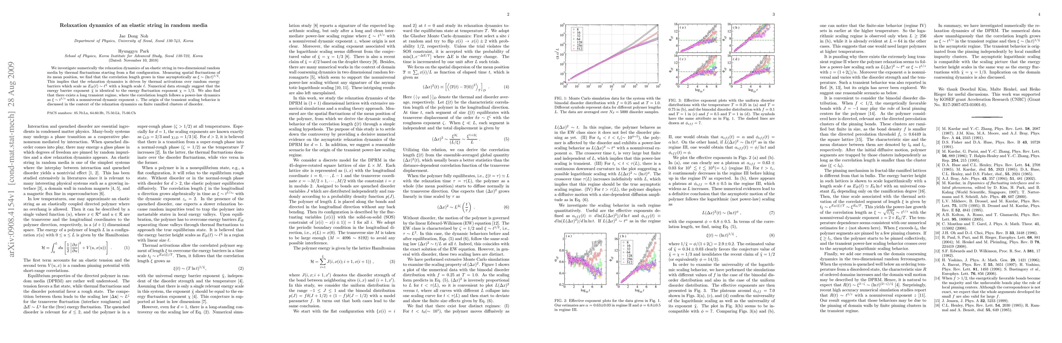 The paper numerically studies the relaxation dynamics of an elastic string in a two-dimensional random medium, finding that the correlation length grows asymptotically as $(\ln t)^{1/\tilde{\chi}}$, suggesting thermal activations over random energy barriers scaling as $\ell^{\tilde{\chi}}$, with $\tilde{\chi}$ likely equal to $\chi=1/3$. Additionally, a transient regime with $\xi \sim t^{1/z}$ is observed, where the dynamic exponent $z$ is nonuniversal, attributed to relaxation dynamics on finite disordered clusters.