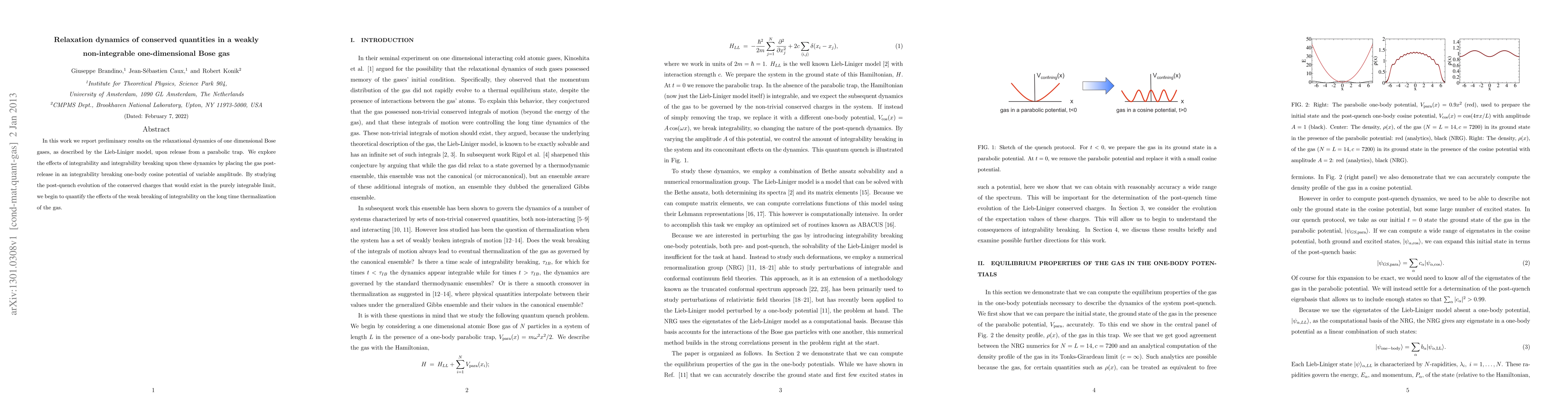In this work we report preliminary results on the relaxational dynamics of one dimensional Bose gases, as described by the Lieb-Liniger model, upon release from a parabolic trap. We explore the effects of integrability and integrability breaking upon these dynamics by placing the gas post-release in an integrability breaking one-body cosine potential of variable amplitude. By studying the post-quench evolution of the conserved charges that would exist in the purely integrable limit, we begin to quantify the effects of the weak breaking of integrability on the long time thermalization of the gas.