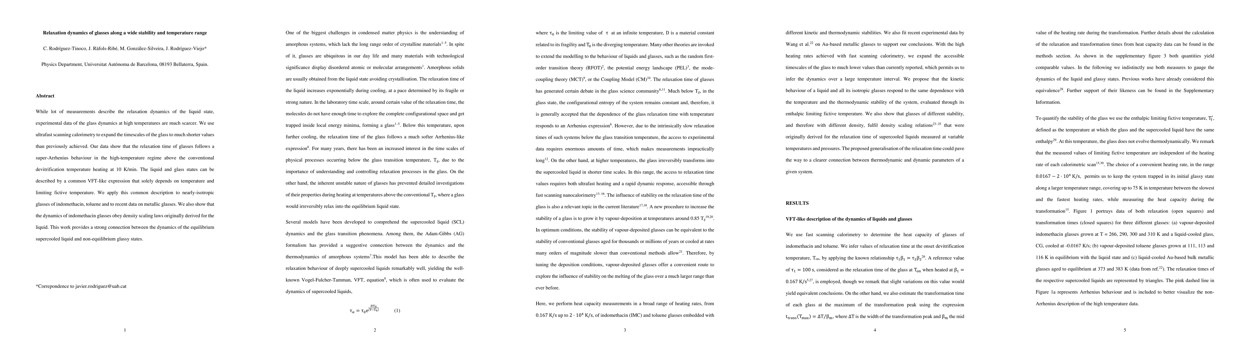 This study uses ultrafast scanning calorimetry to investigate the relaxation dynamics of glasses at high temperatures, revealing a super-Arrhenius behavior. The findings suggest a common VFT-like expression for both liquid and glass states, highlighting a strong connection between the dynamics of supercooled liquids and non-equilibrium glassy states.