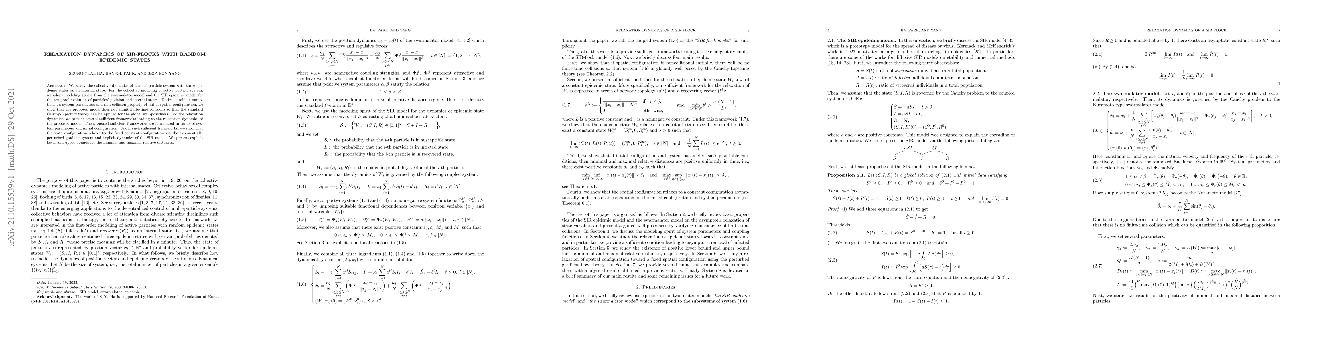 This paper models the collective dynamics of a multi-particle system using a combination of the swarmalator and SIR epidemic models. It demonstrates global well-posedness and provides sufficient frameworks for the relaxation dynamics, showing that the system converges to a fixed configuration via an exponentially perturbed gradient system.