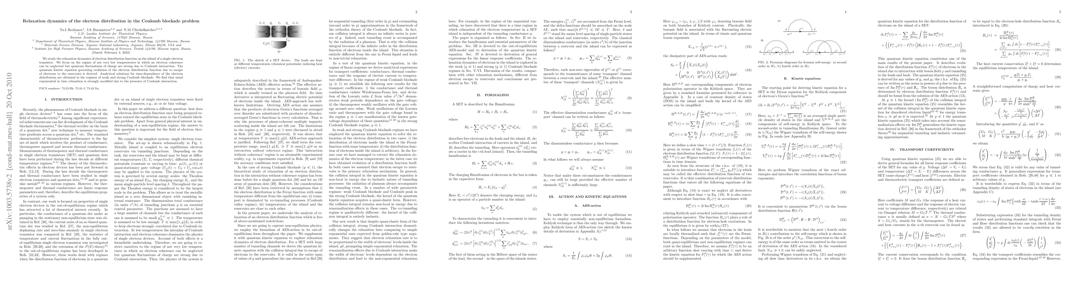 This paper investigates the relaxation dynamics of electron distribution in a single electron transistor under the Coulomb blockade, deriving a quantum kinetic equation and obtaining analytical solutions that show modified relaxation behavior due to strong Coulomb interactions, differing from typical exponential decay.