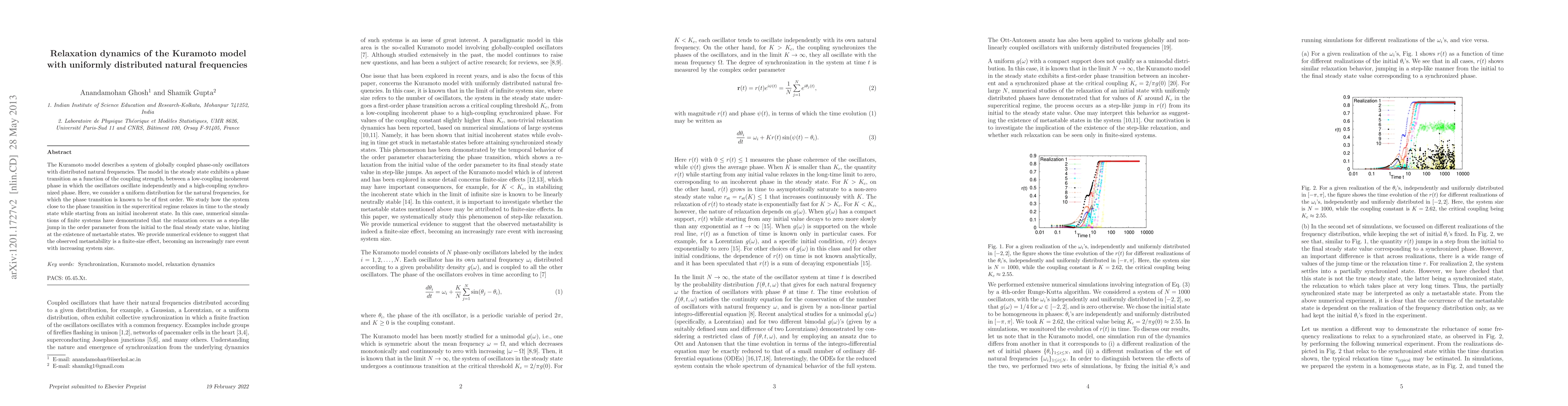 This paper investigates the relaxation dynamics of the Kuramoto model with uniformly distributed natural frequencies, focusing on the transition from incoherent to synchronized states. Numerical simulations reveal a step-like jump in the order parameter, suggesting metastable states, which appear to diminish as system size increases.