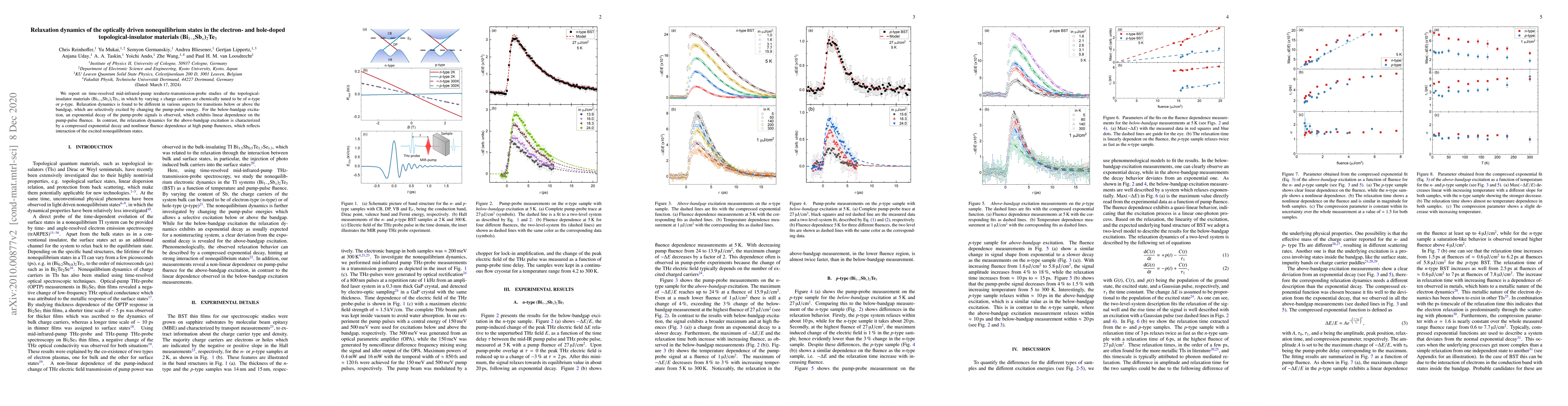 This paper investigates the relaxation dynamics of optically driven nonequilibrium states in electron- and hole-doped topological-insulator materials $(Bi_{1-x}Sb_{x})_{2}Te_{3}$ using time-resolved mid-infrared-pump terahertz-transmission-probe studies. The study reveals distinct relaxation dynamics for excitations below and above the bandgap, with below-bandgap showing exponential decay and above-bandgap exhibiting compressed exponential decay and nonlinear fluence dependence at high pump energies.