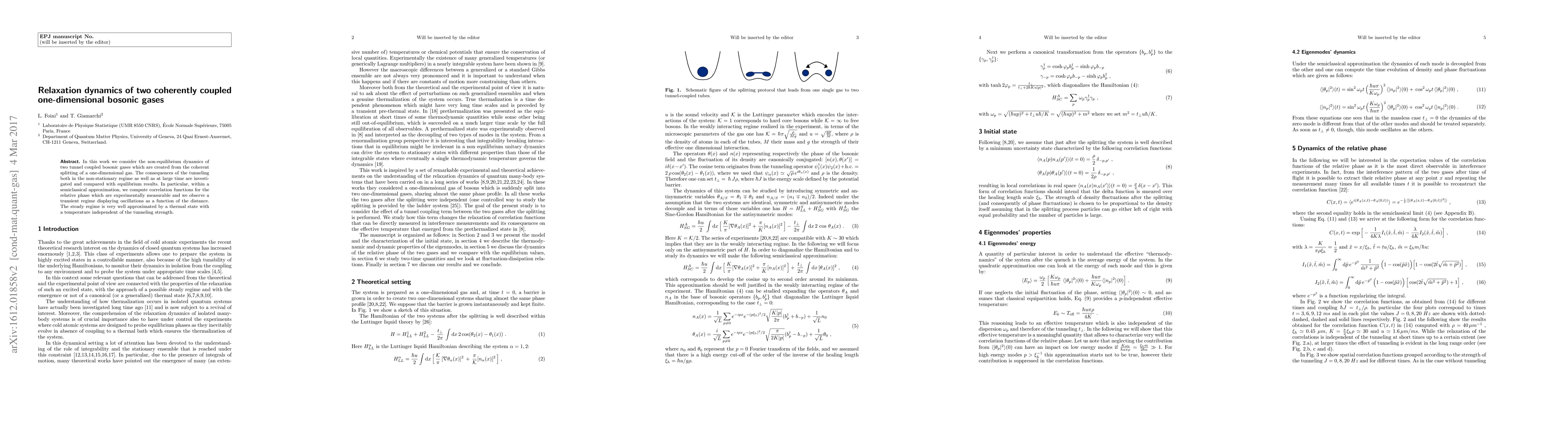 In this work we consider the non-equilibrium dynamics of two tunnel coupled bosonic gases which are created from the coherent splitting of a one-dimensional gas. The consequences of the tunneling both in the non-stationary regime as well as at large time are investigated and compared with equilibrium results. In particular, within a semiclassical approximation, we compute correlation functions for the relative phase which are experimentally measurable and we observe a transient regime displaying oscillations as a function of the distance. The steady regime is very well approximated by a thermal state with a temperature independent of the tunneling strength.