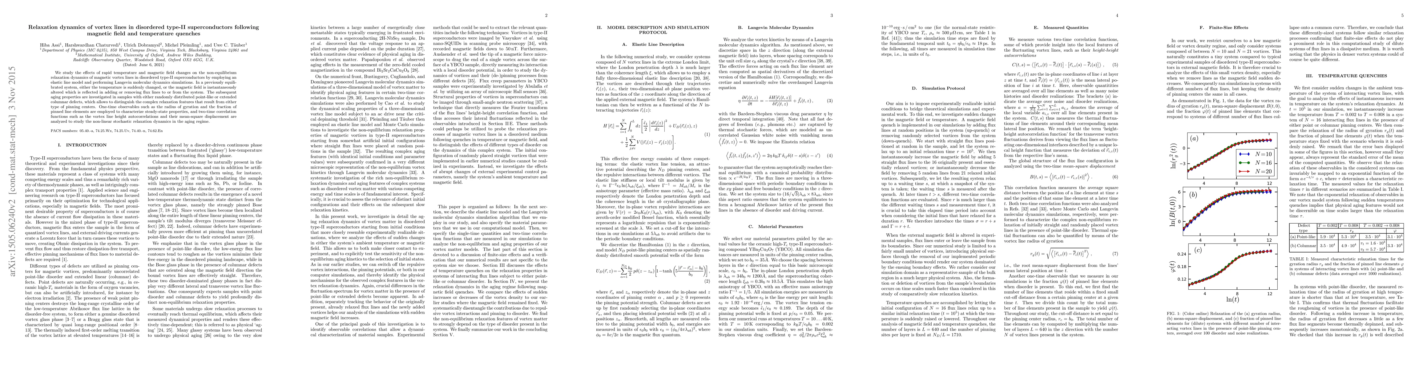 This research investigates the relaxation dynamics of vortex lines in disordered type-II superconductors after sudden temperature or magnetic field changes, using simulations to study how defects affect vortex pinning. It employs both one-time observables and two-time correlation functions to characterize the complex aging behaviors and non-linear stochastic dynamics.
