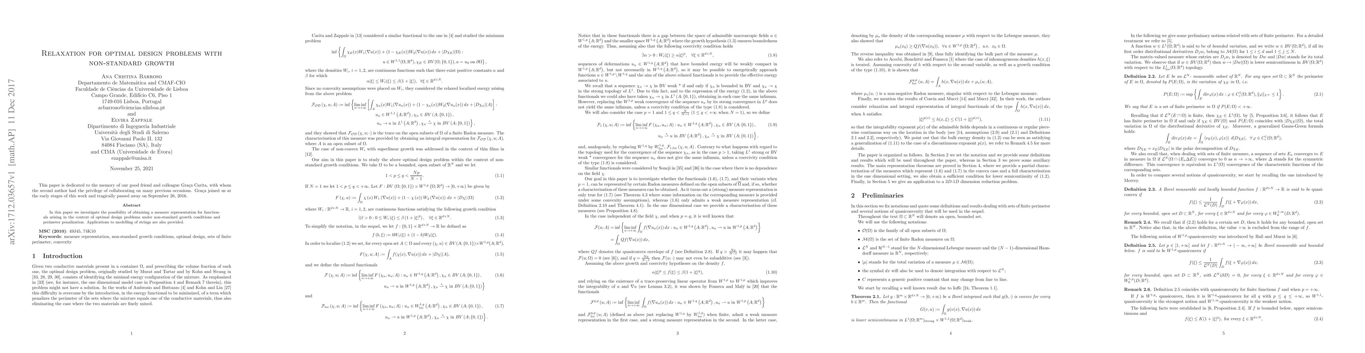 In this paper we investigate the possibility of obtaining a measure representation for function- als arising in the context of optimal design problems under non-standard growth conditions and perimeter penalization. Applications to modelling of strings are also provided.