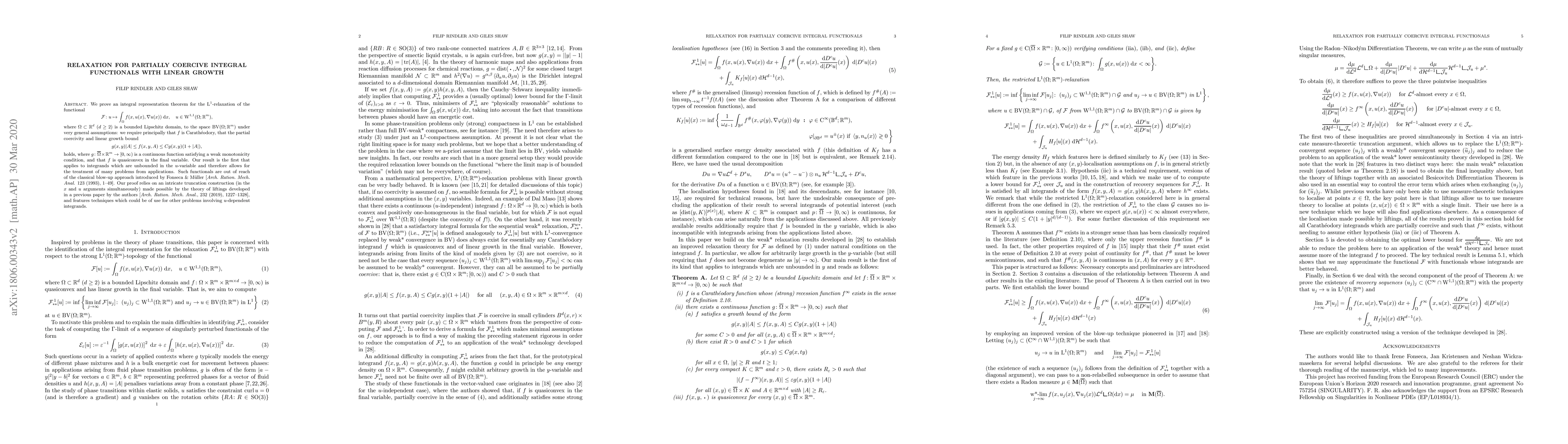 The paper proves an integral representation theorem for a functional with linear growth, allowing it to be relaxed from L1 to BV spaces under general assumptions, providing a solution to problems involving unbounded integrands.