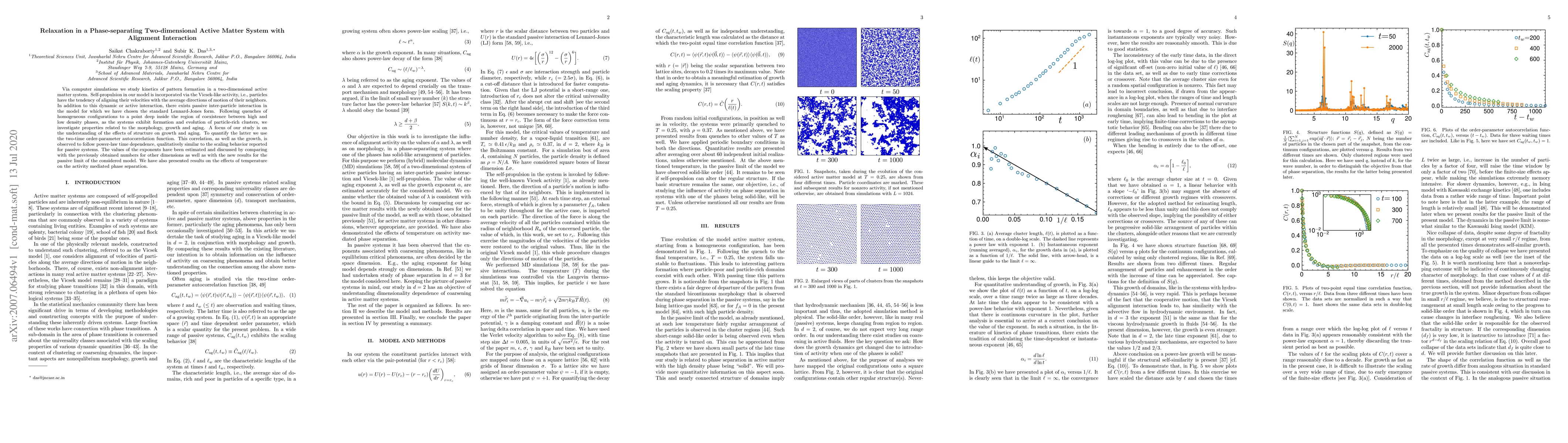 Via computer simulations we study kinetics of pattern formation in a two-dimensional active matter system. Self-propulsion in our model is incorporated via the Vicsek-like activity, i.e., particles have the tendency of aligning their velocities with the average directions of motion of their neighbors. In addition to this dynamic or active interaction, there exists passive inter-particle interaction in the model for which we have chosen the standard Lennard-Jones form. Following quenches of homogeneous configurations to a point deep inside the region of coexistence between high and low density phases, as the systems exhibit formation and evolution of particle-rich clusters, we investigate properties related to the morphology, growth and aging. A focus of our study is on the understanding of the effects of structure on growth and aging. To quantify the latter we use the two-time order-parameter autocorrelation function. This correlation, as well as the growth, is observed to follow power-law time dependence, qualitatively similar to the scaling behavior reported for passive systems. The values of the exponents have been estimated and discussed by comparing with the previously obtained numbers for other dimensions as well as with the new results for the passive limit of the considered model. We have also presented results on the effects of temperature on the activity mediated phase separation.
