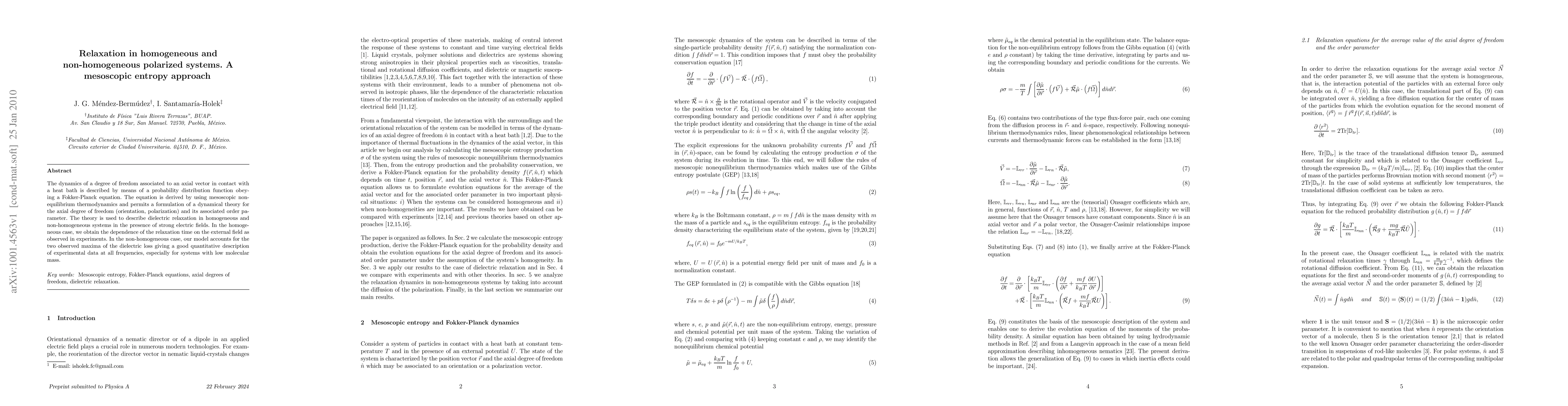This paper develops a mesoscopic entropy approach to describe the dynamics of axial vector polarization in contact with a heat bath, using a Fokker-Planck equation. It provides a theoretical framework for dielectric relaxation in both homogeneous and non-homogeneous systems under strong electric fields, accurately predicting relaxation times and explaining observed maxima in dielectric loss.