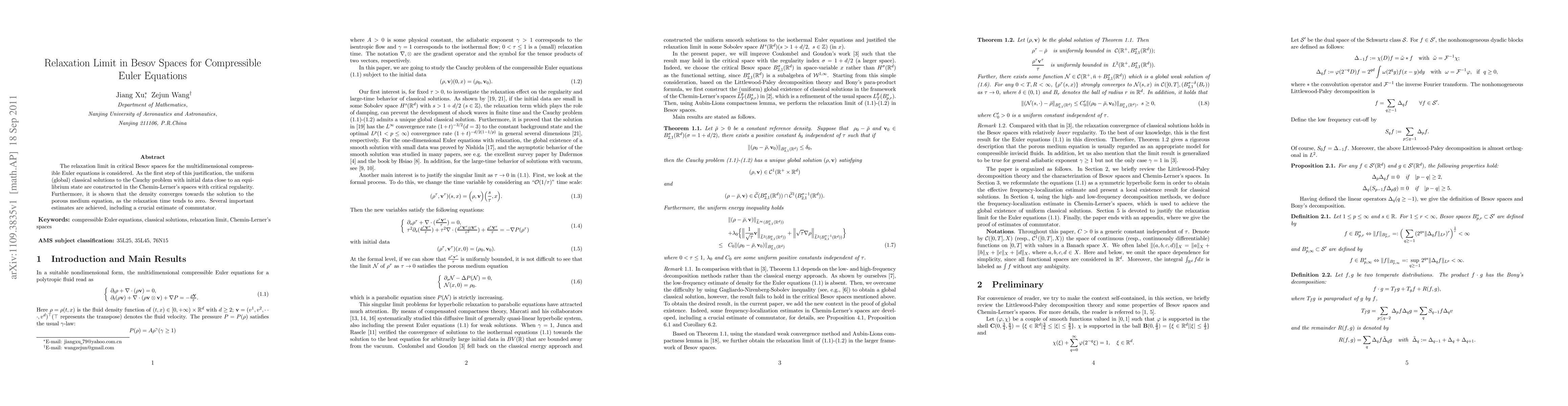 Researchers constructed uniform classical solutions to compressible Euler equations in critical Besov spaces, showing that density converges towards the solution of a related porous medium equation as relaxation time approaches zero.
