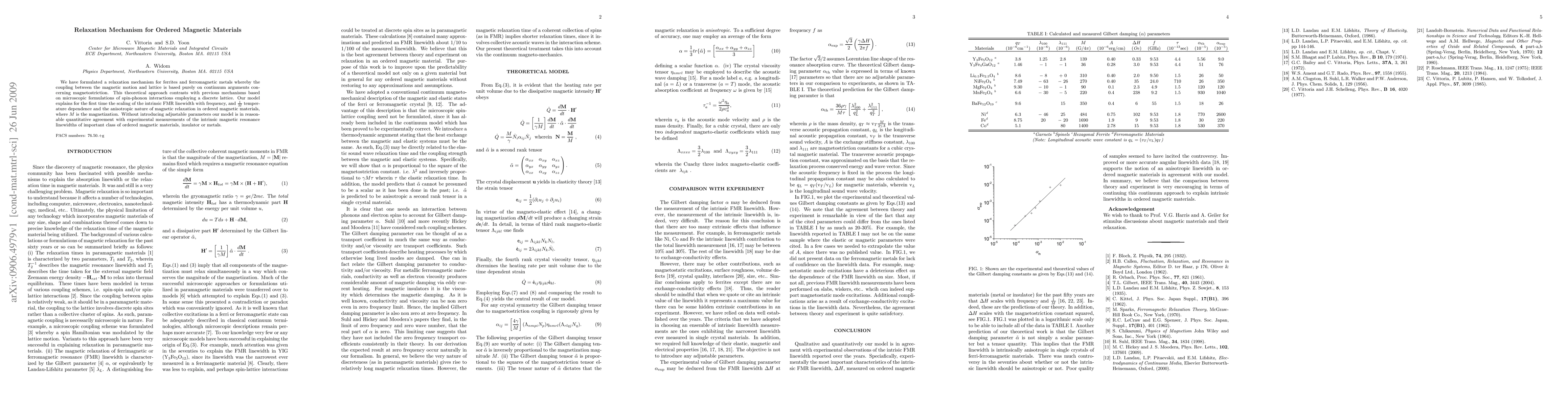 We have formulated a relaxation mechanism for ferrites and ferromagnetic metals whereby the coupling between the magnetic motion and lattice is based purely on continuum arguments concerning magnetostriction. This theoretical approach contrasts with previous mechanisms based on microscopic formulations of spin-phonon interactions employing a discrete lattice. Our model explains for the first time the scaling of the intrinsic FMR linewidth with frequency, and 1/M temperature dependence and the anisotropic nature of magnetic relaxation in ordered magnetic materials, where M is the magnetization. Without introducing adjustable parameters our model is in reasonable quantitative agreement with experimental measurements of the intrinsic magnetic resonance linewidths of important class of ordered magnetic materials, insulator or metals.