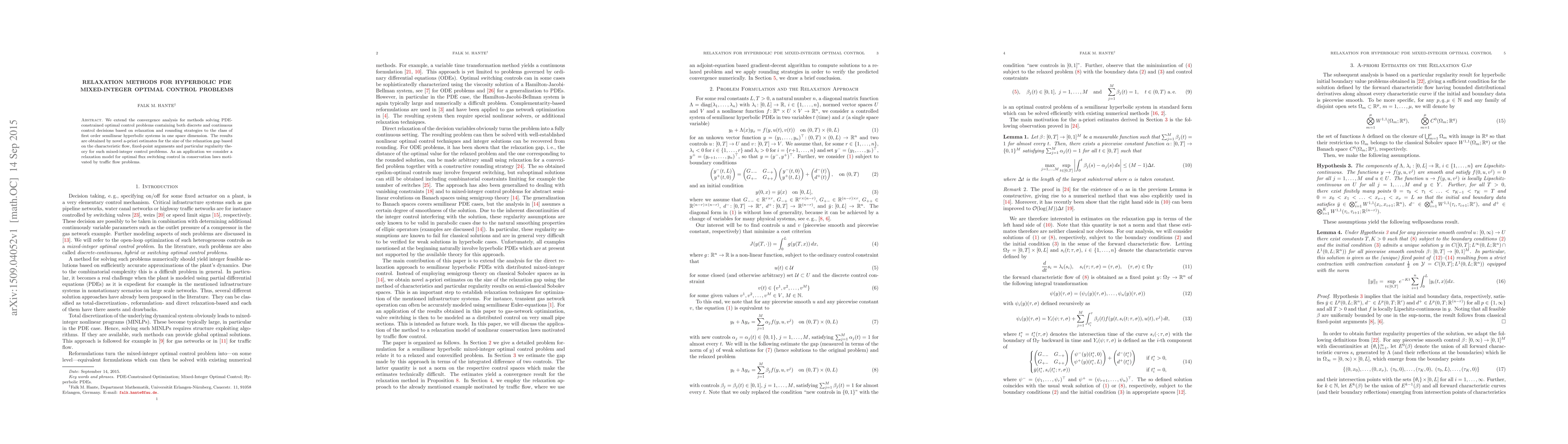 This paper extends convergence analysis for solving PDE-constrained optimal control problems using relaxation and rounding methods to first-order semilinear hyperbolic systems. It introduces novel a-priori estimates and applies these to a model for optimal flux switching control in traffic flow problems.