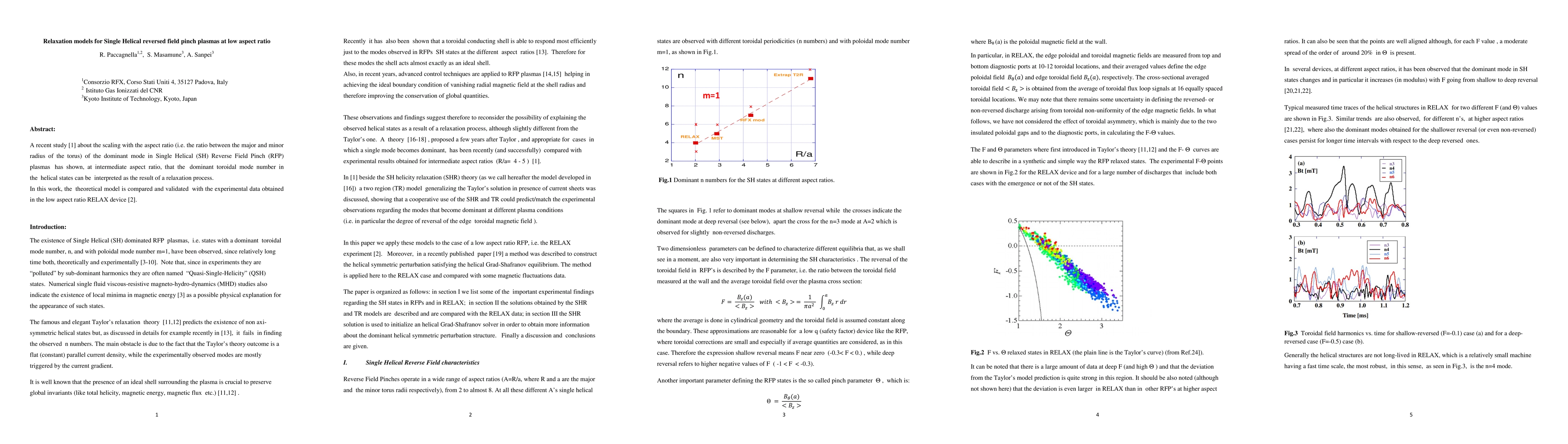 This paper investigates the relaxation models for Single Helical Reversed Field Pinch (RFP) plasmas at low aspect ratios, comparing theoretical models to experimental data from the RELAX device. The study validates the interpretation of the dominant toroidal mode number as a result of a relaxation process at intermediate aspect ratios.