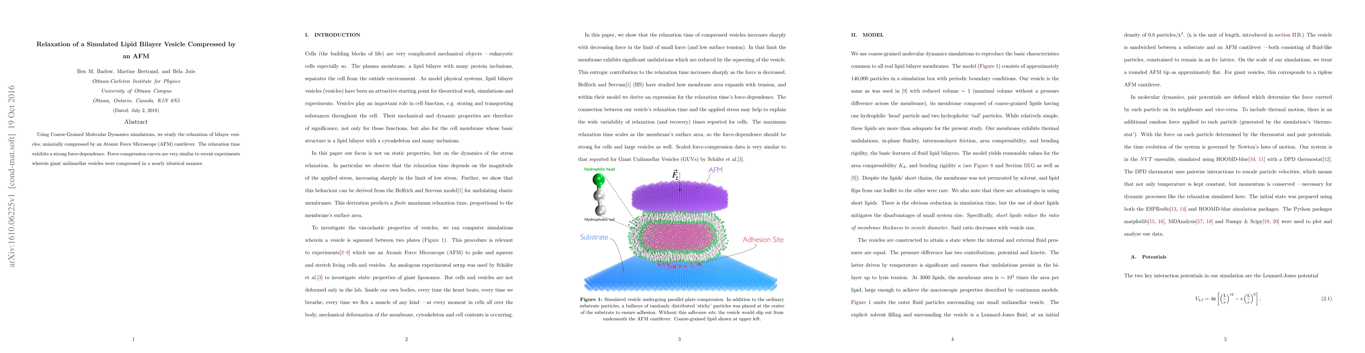 Using Coarse-Grained Molecular Dynamics simulations, we study the relaxation of bilayer vesicles, uniaxially compressed by an Atomic Force Microscope (AFM) cantilever. The relaxation time exhibits a strong force-dependence. Force-compression curves are very similar to recent experiments wherein giant unilamellar vesicles were compressed in a nearly identical manner.