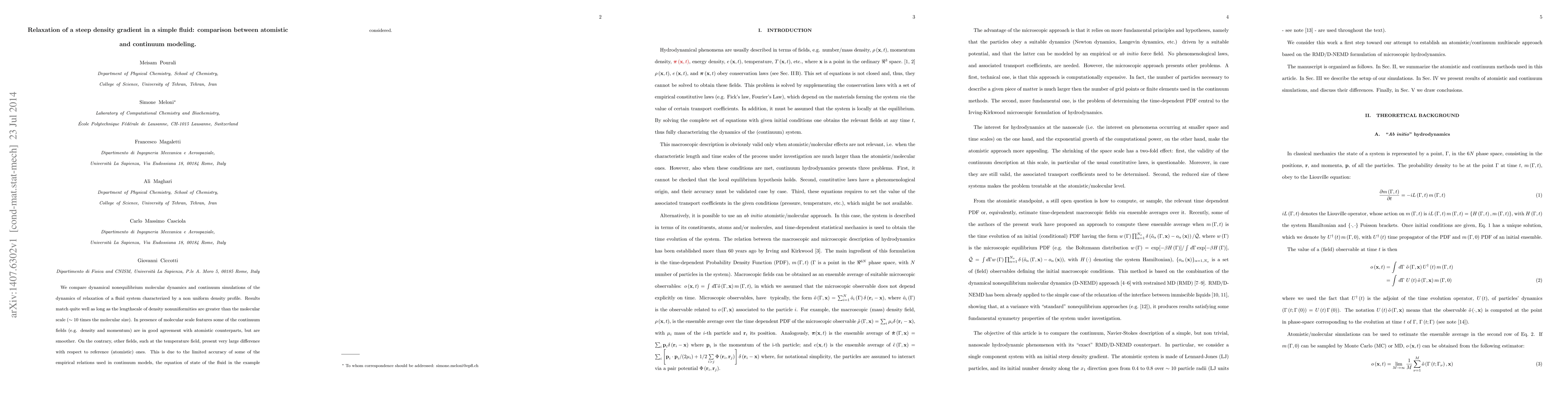 The research compares molecular dynamics and continuum simulations for a fluid's density gradient relaxation, finding good agreement when nonuniformities are larger than molecular scale. However, at molecular scale, some continuum fields match atomistic ones but are smoother, while others like temperature fields show significant discrepancies due to empirical relation limitations in continuum models.